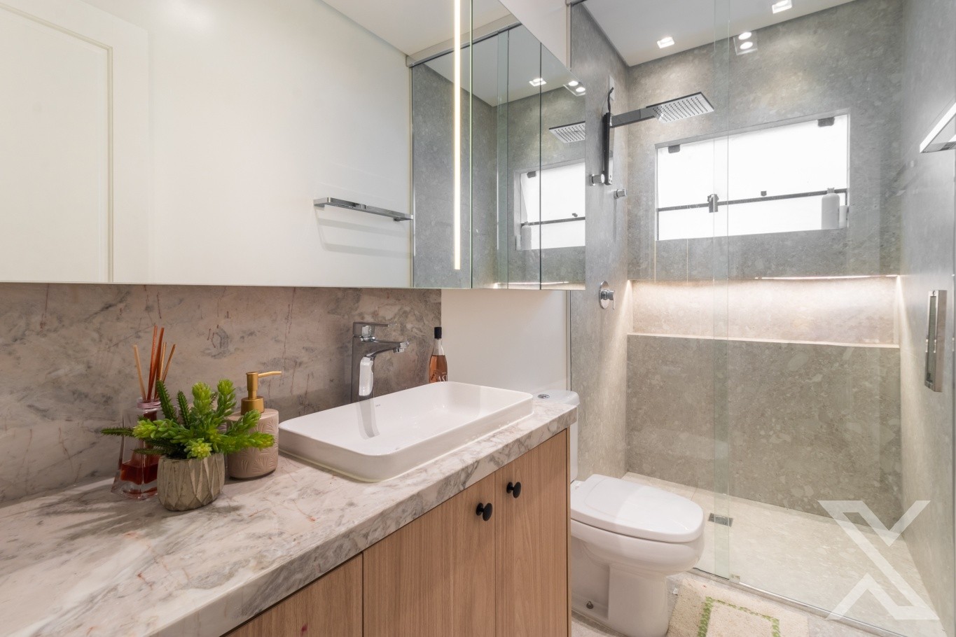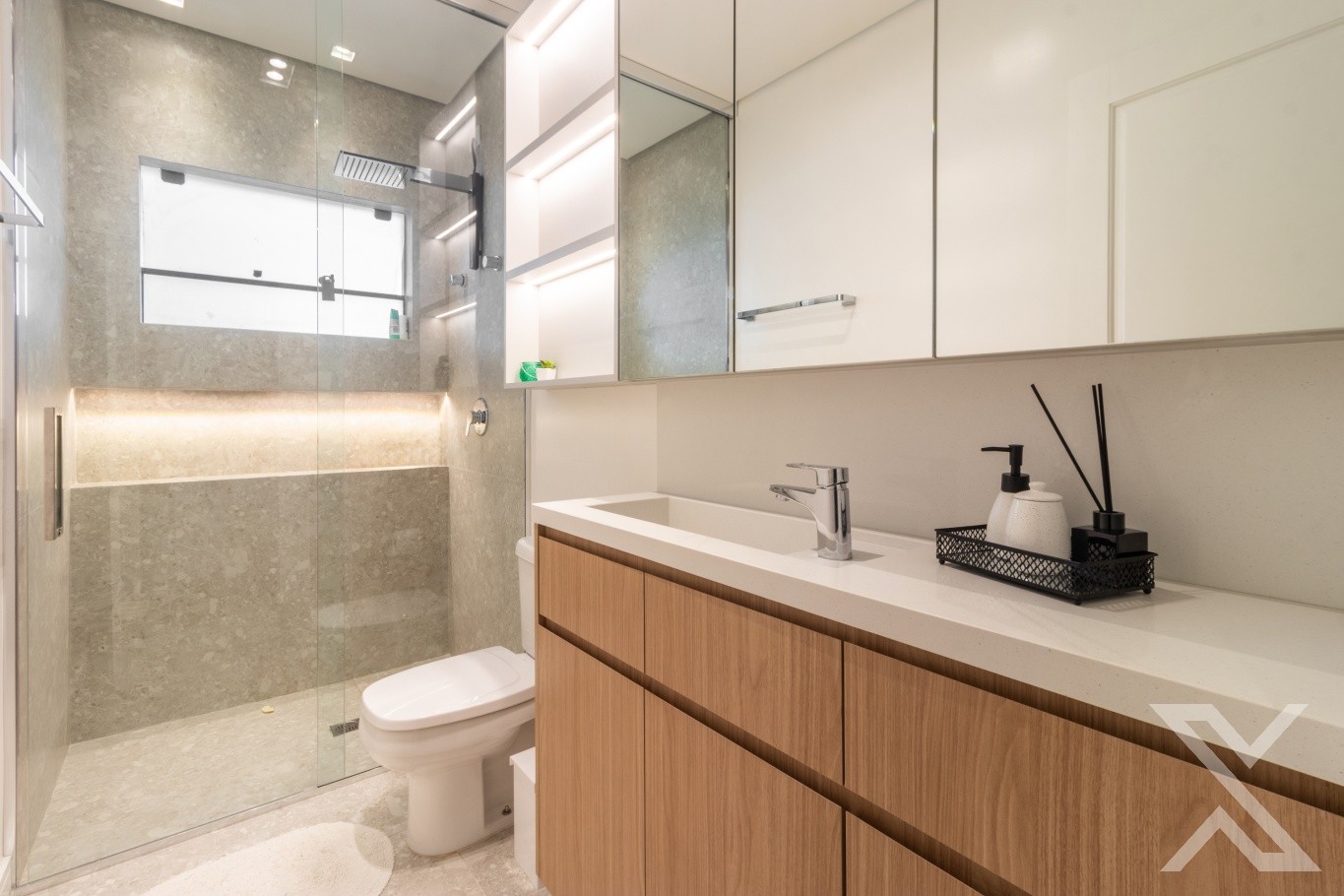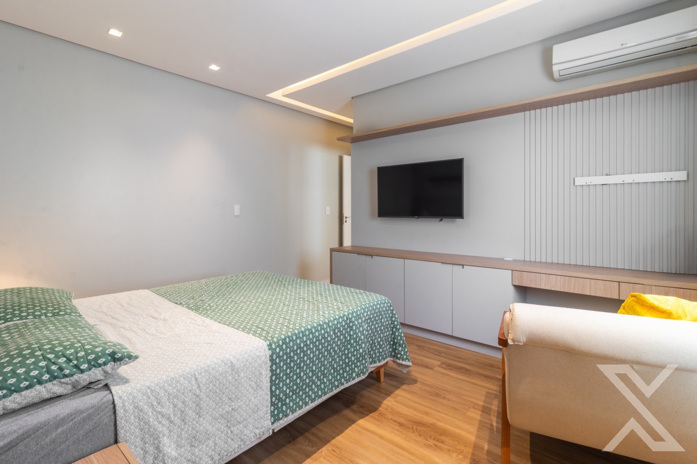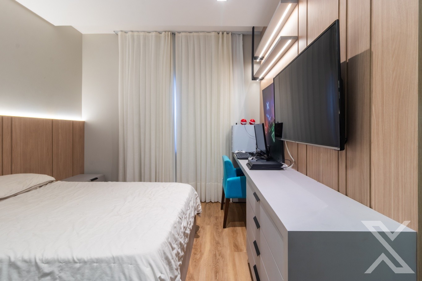 Revestimentos em porcelanato e vinílico, forro rebaixado em gesso com iluminação personalizada.
