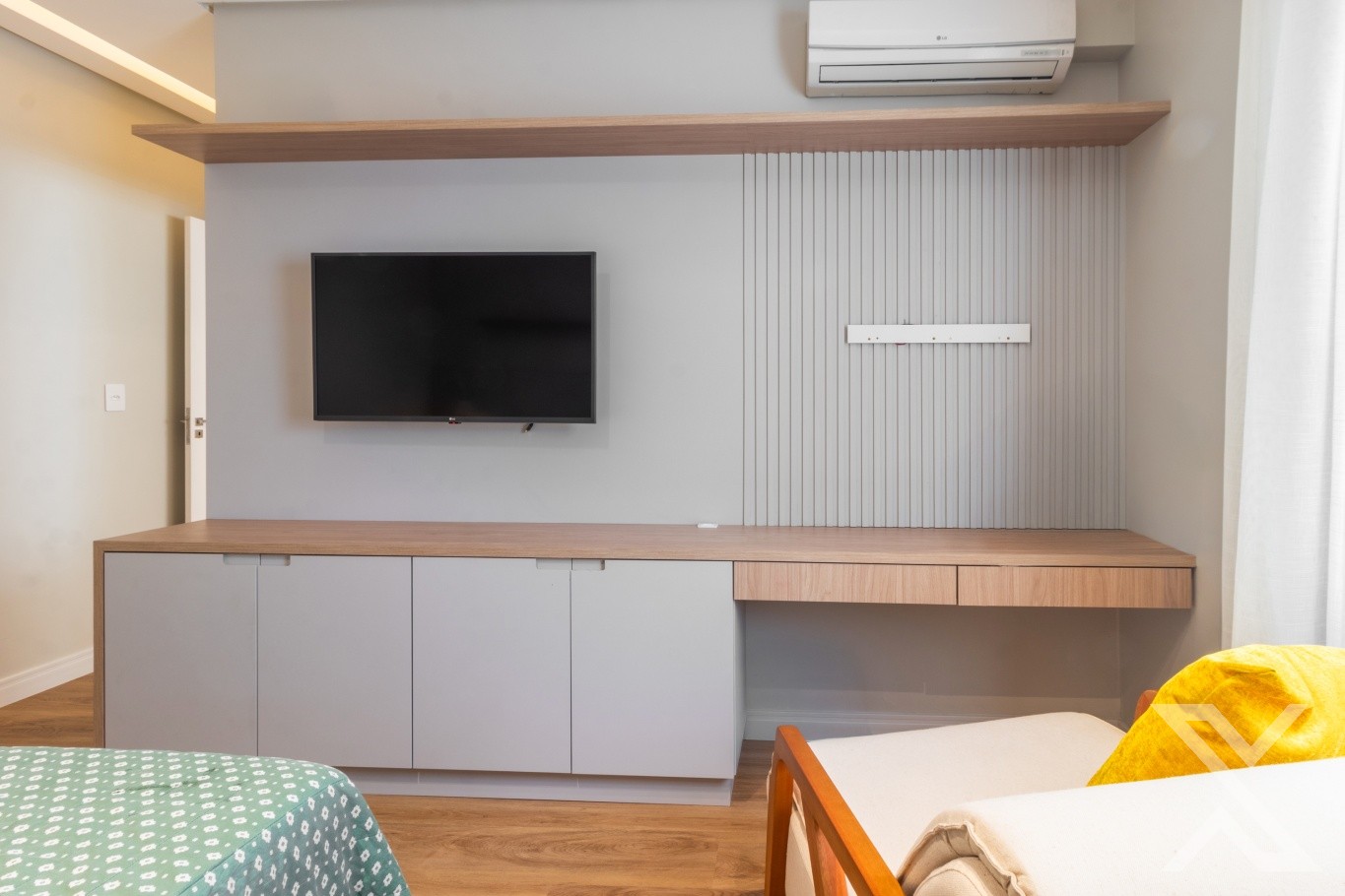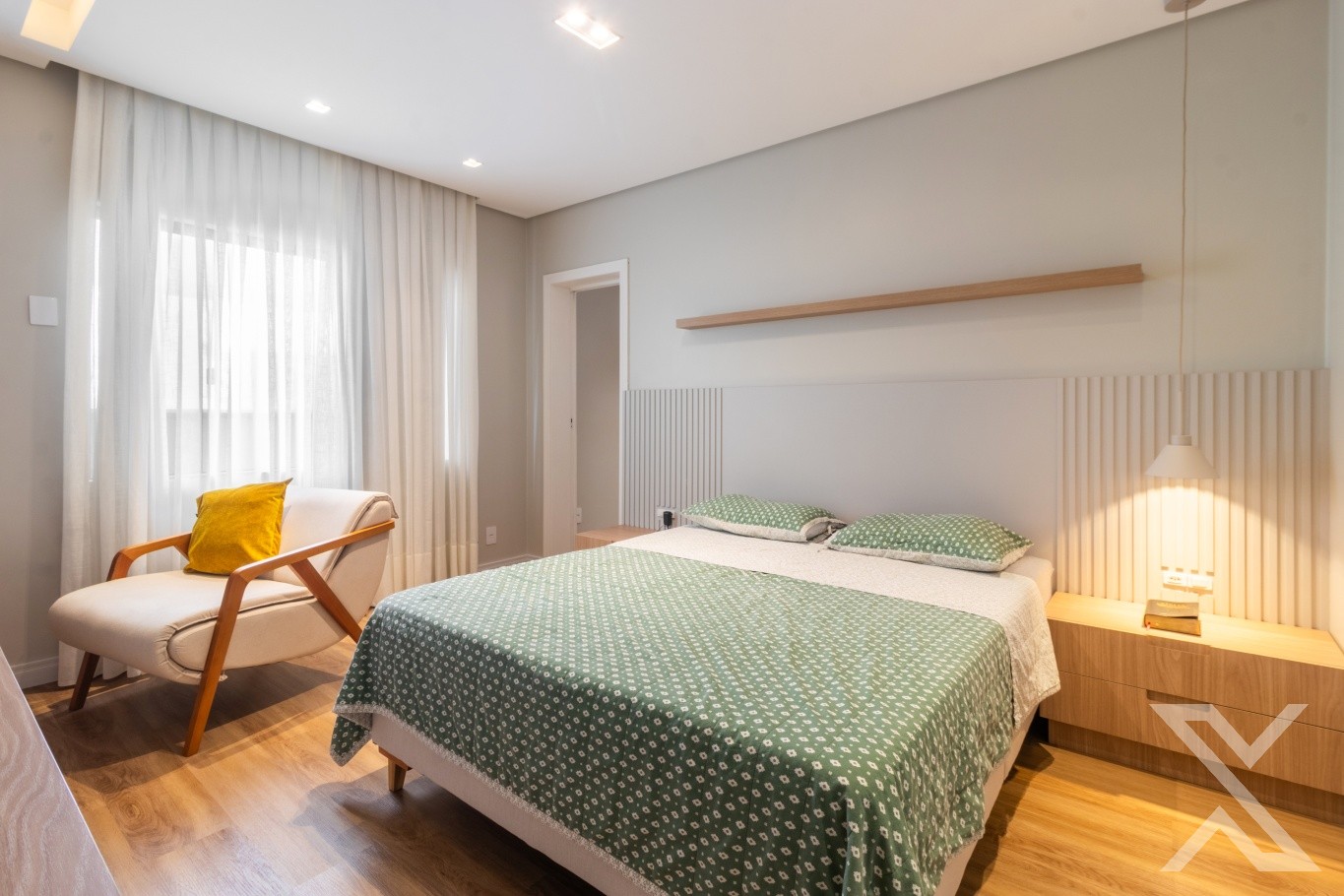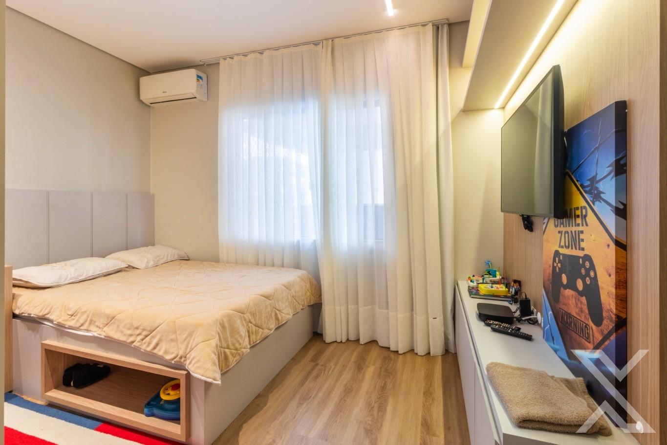 Revestimentos em porcelanato e vinílico, forro rebaixado em gesso com iluminação personalizada.