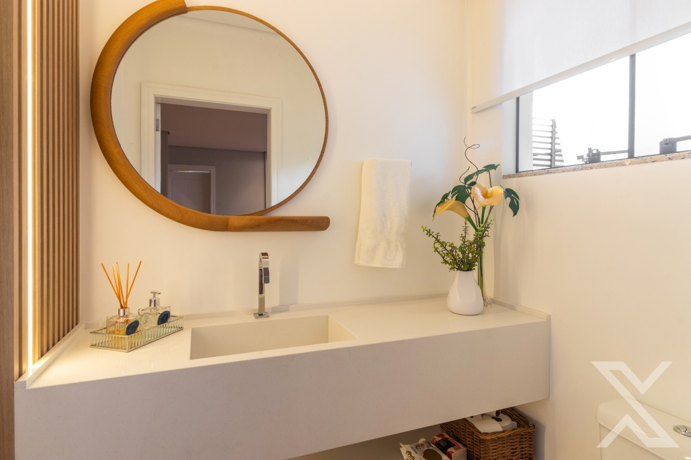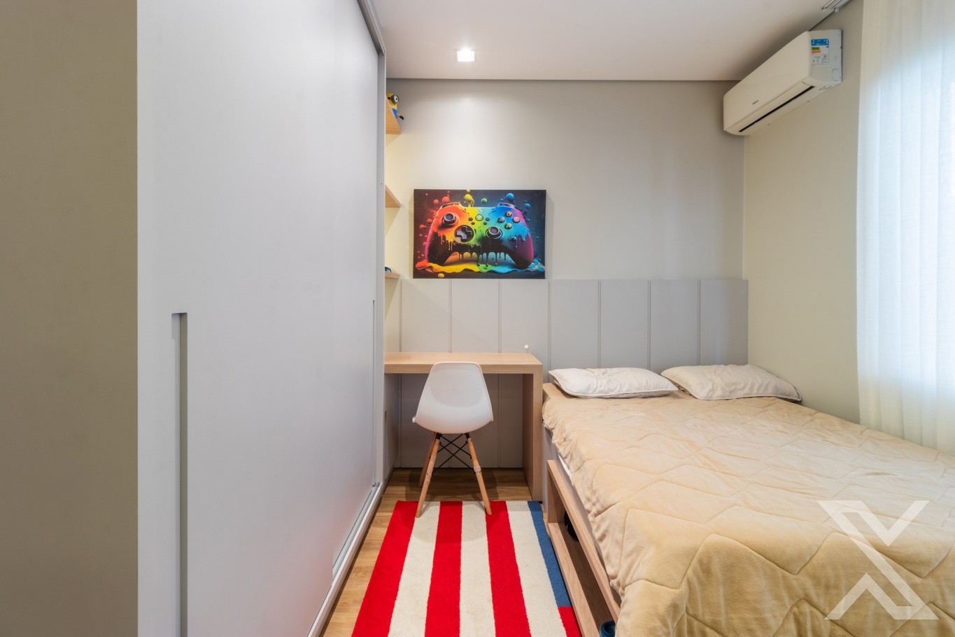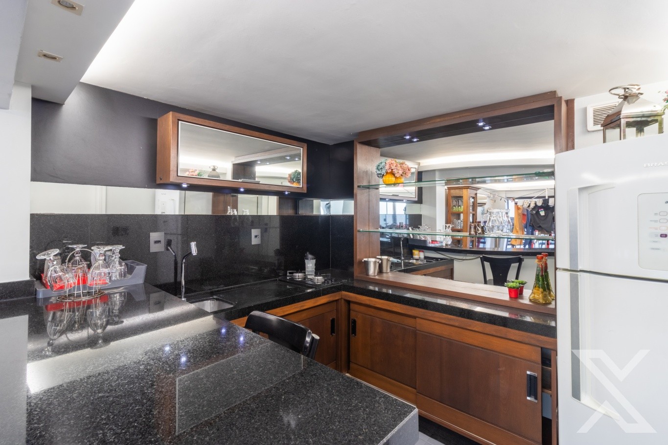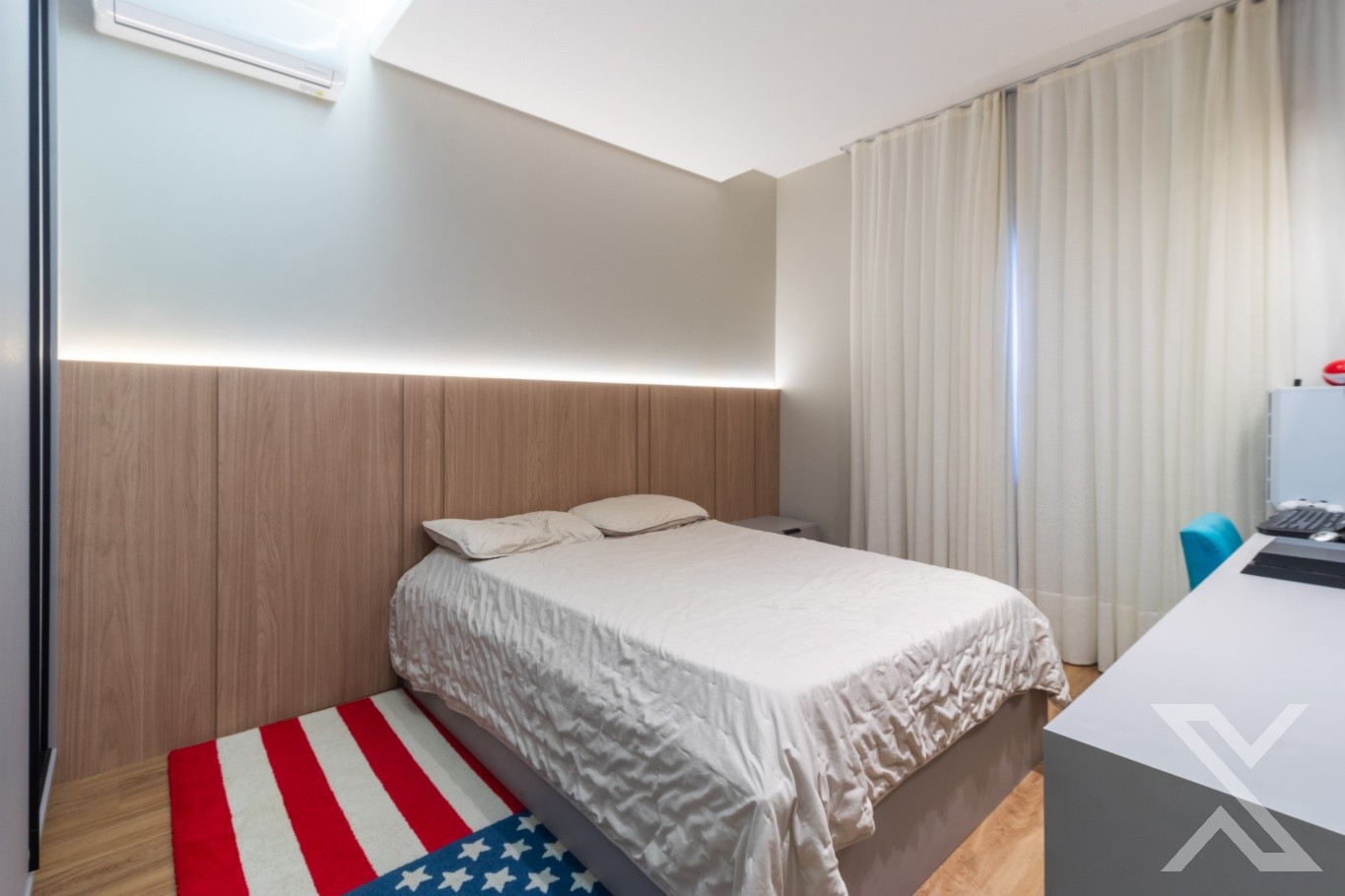 Revestimentos em porcelanato e vinílico, forro rebaixado em gesso com iluminação personalizada.