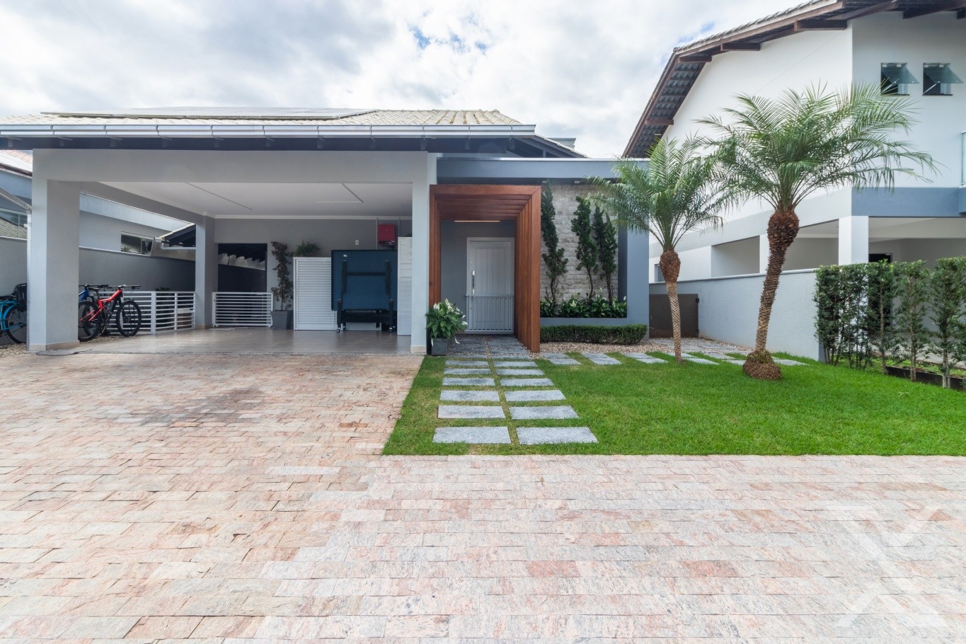 Desfrute de piscina privativa, área gourmet equipada com churrasqueira, fogão a lenha e forno de pizza, e um jardim planejado com amplos espaços ao ar livre.