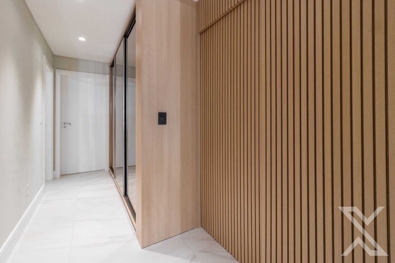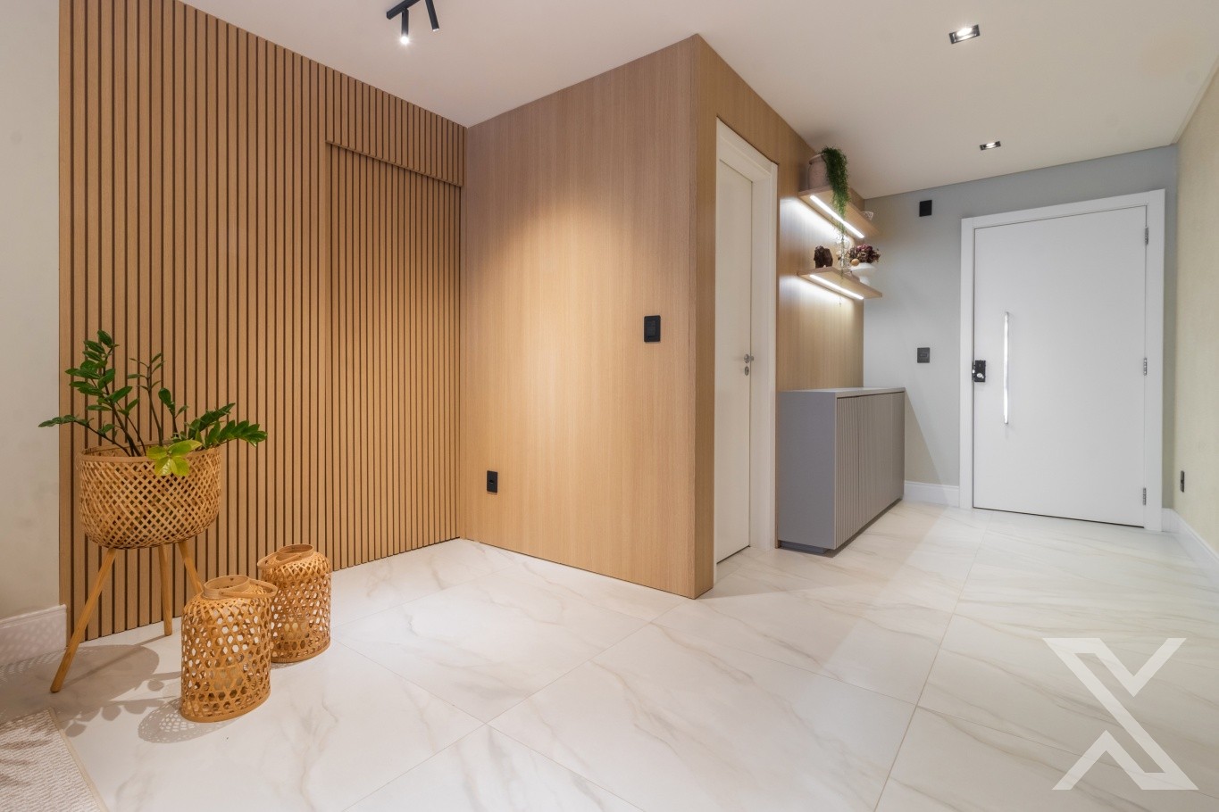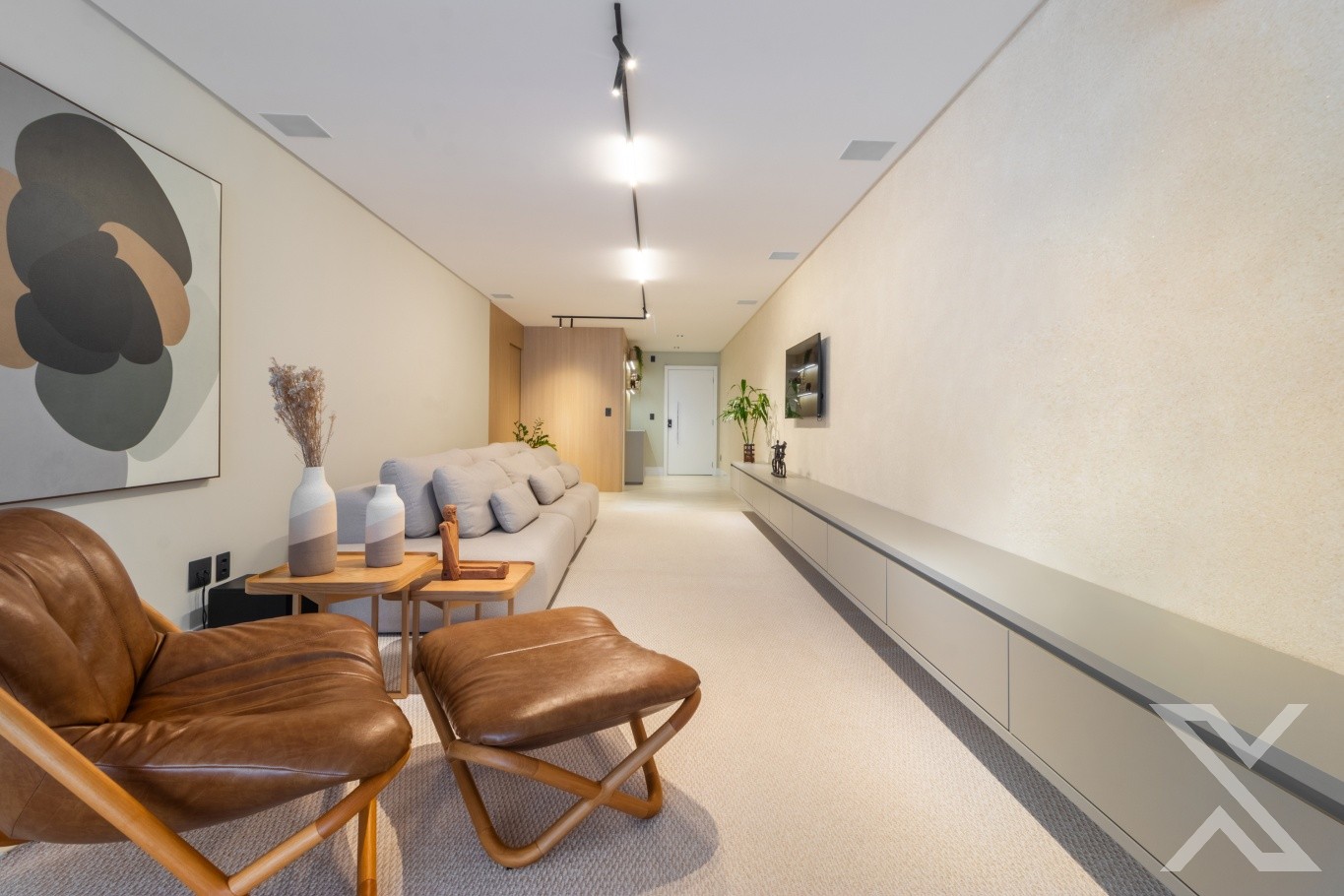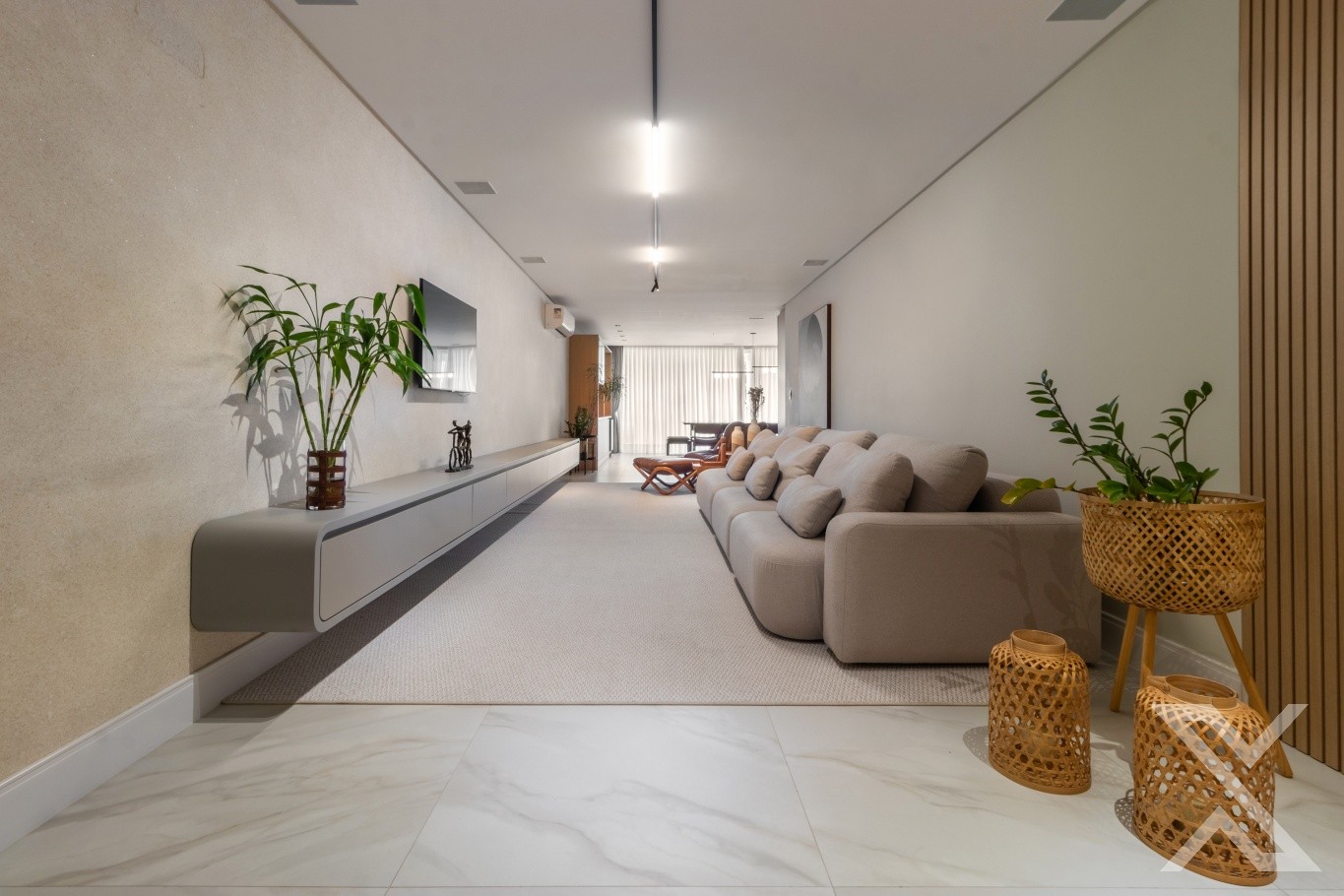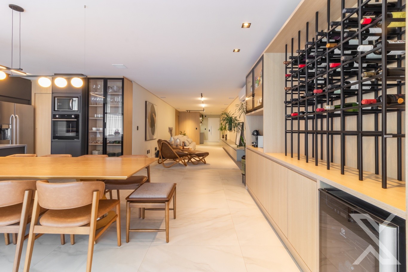 O projeto luminotécnico e os revestimentos neutros reforçam a atmosfera acolhedora e sofisticada.