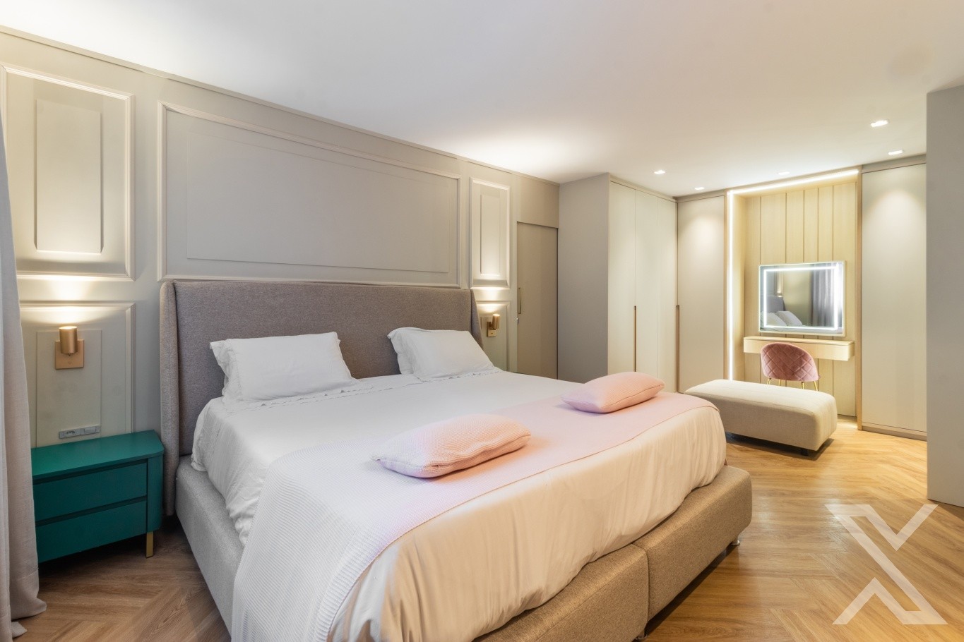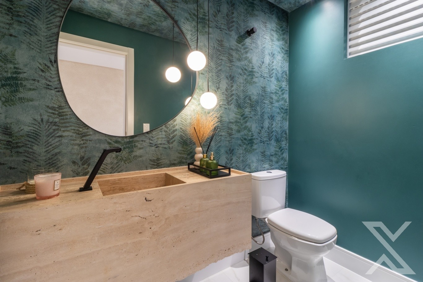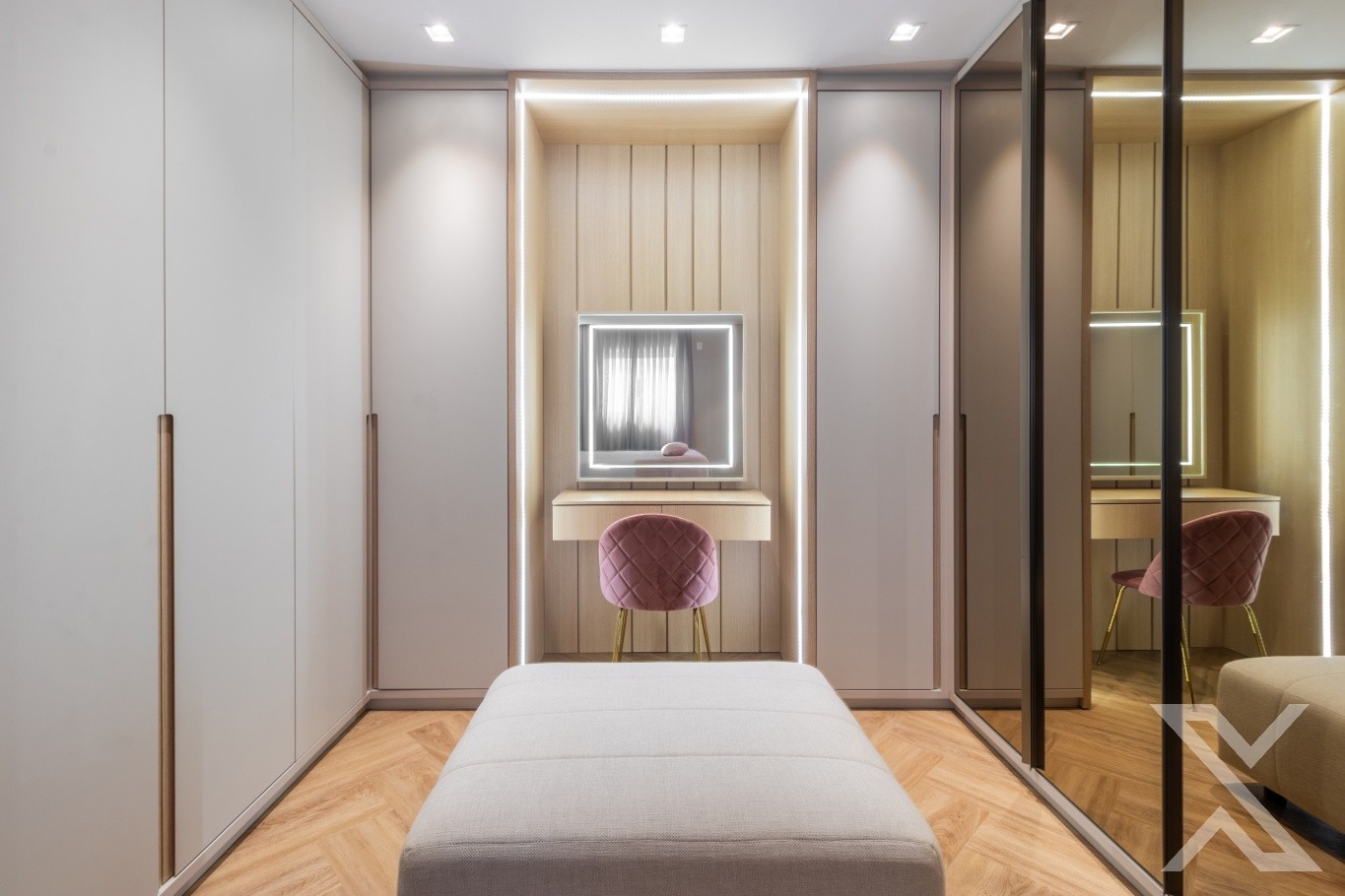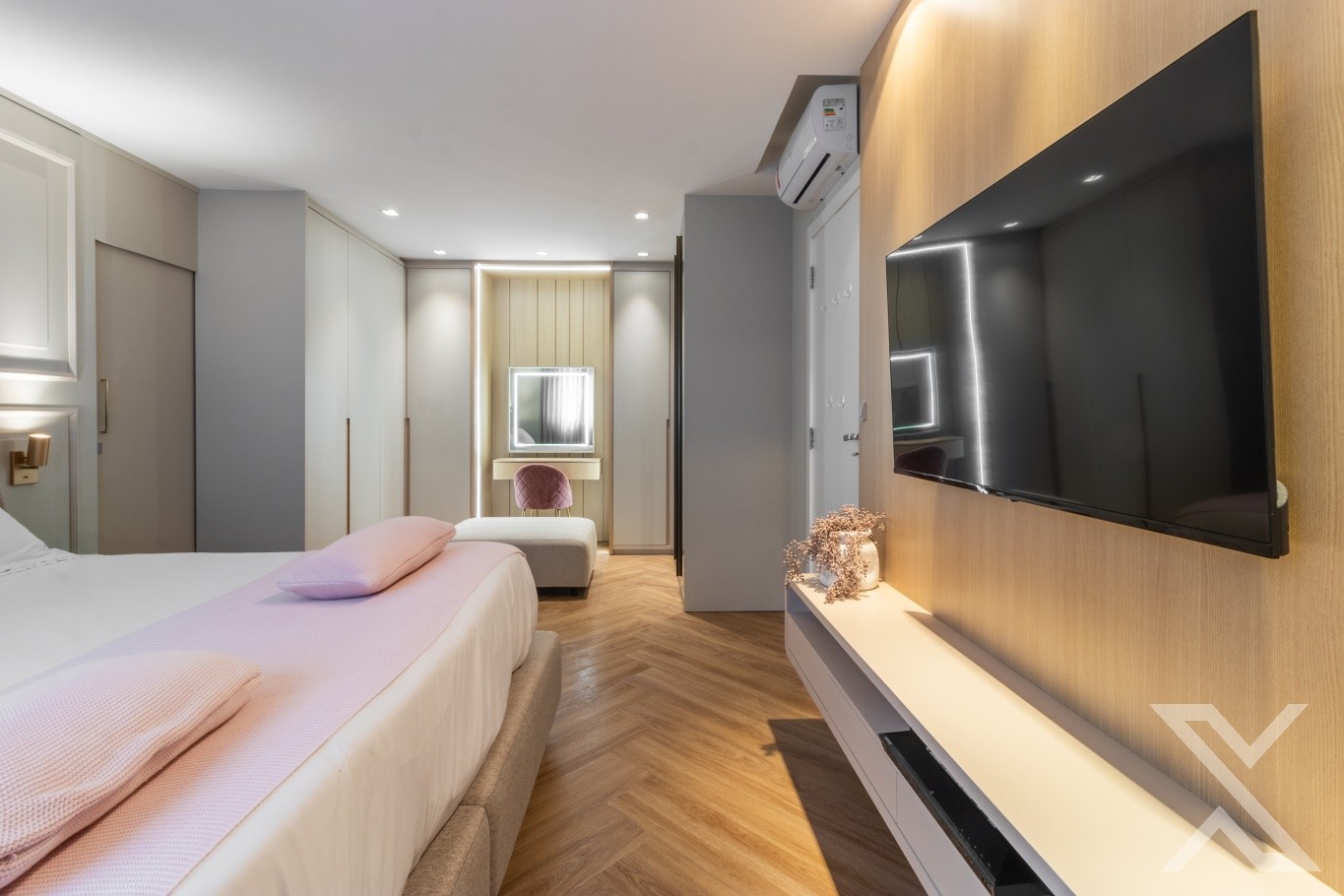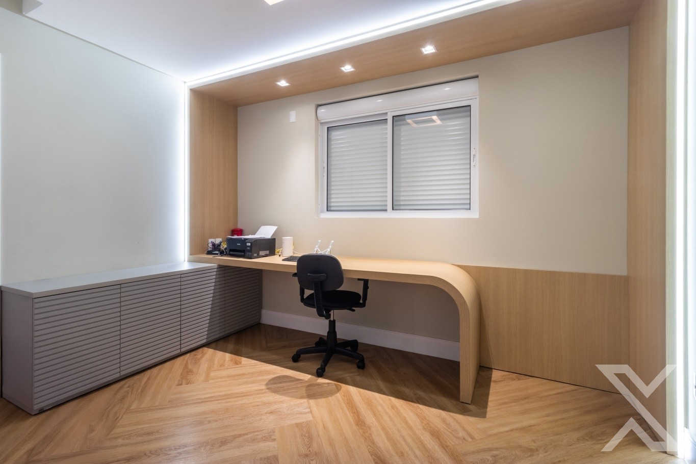 O projeto luminotécnico e os revestimentos neutros reforçam a atmosfera acolhedora e sofisticada.