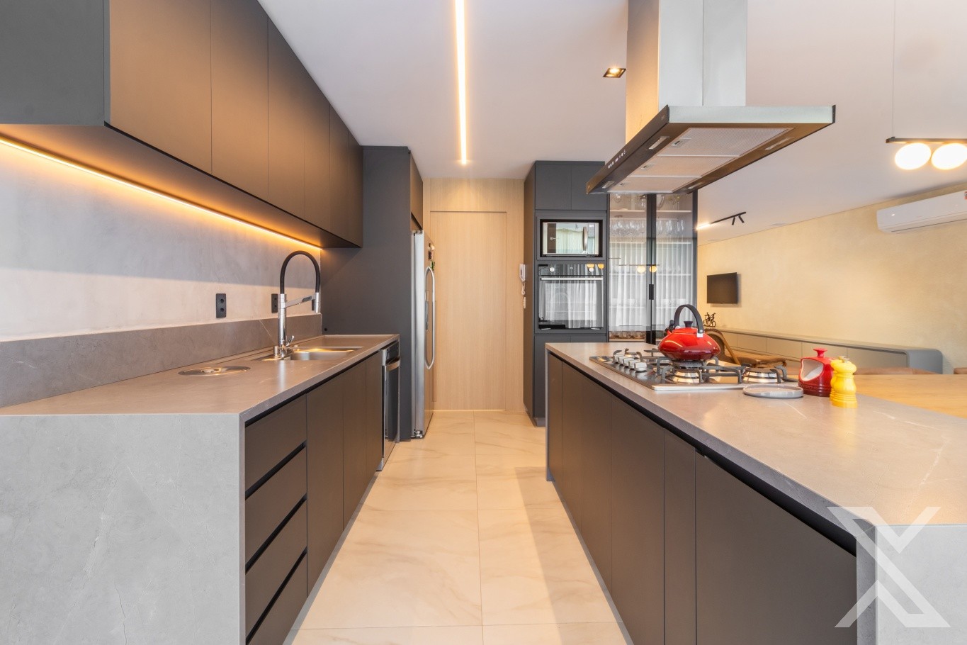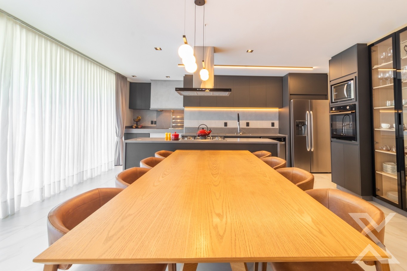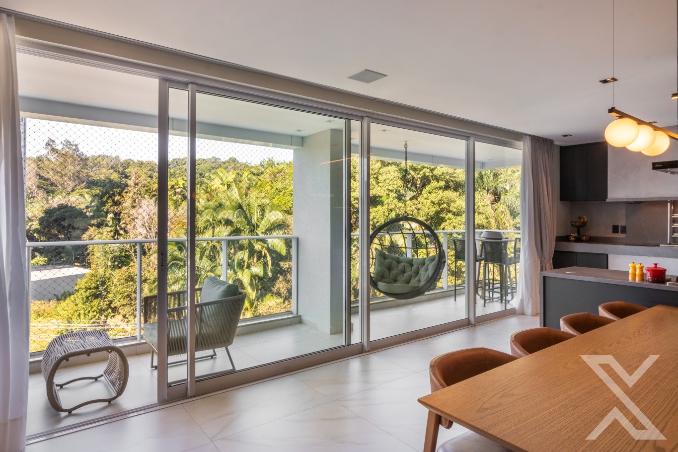 A sala de estar e jantar se abrem para grandes esquadrias que permitem a entrada abundante de luz natural, valorizando o pé-direito e a sensação de amplitude. A cozinha moderna, com linhas minimalistas e acabamentos de alto nível, é perfeita para quem valoriza praticidade sem abrir mão do estilo.