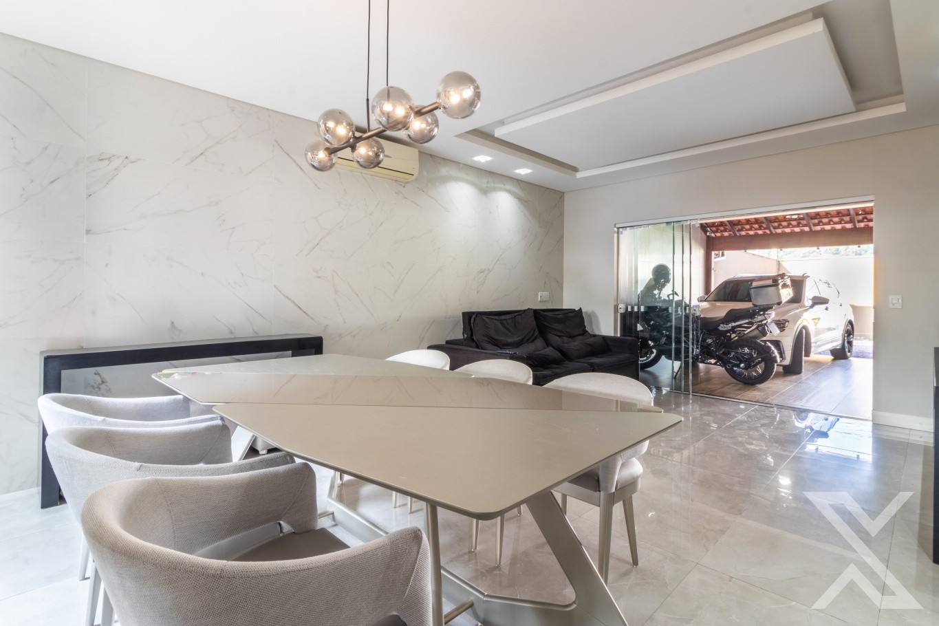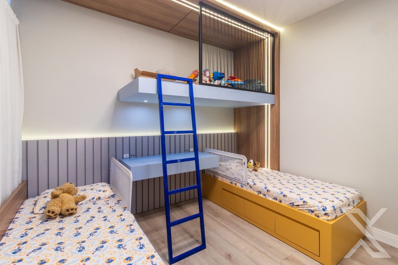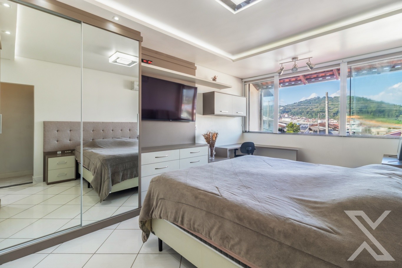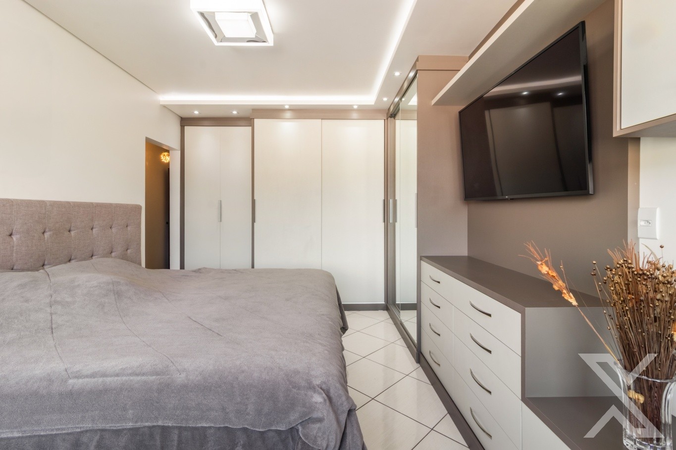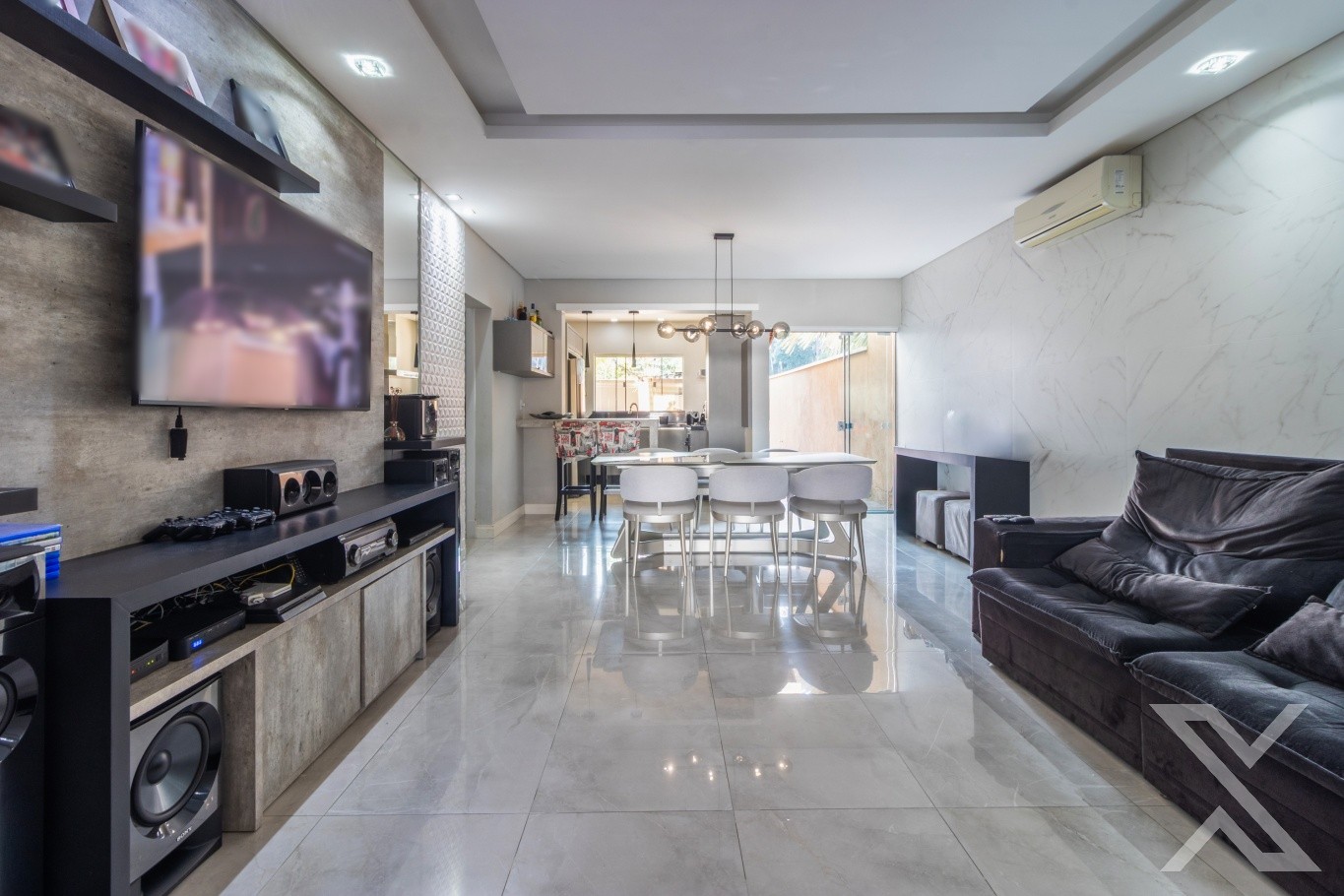 Revestimentos em cerâmico e vinílico, teto rebaixado em gesso com iluminação personalizada, toda casa com sistema de segurança via aplicativo.