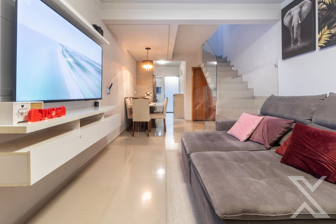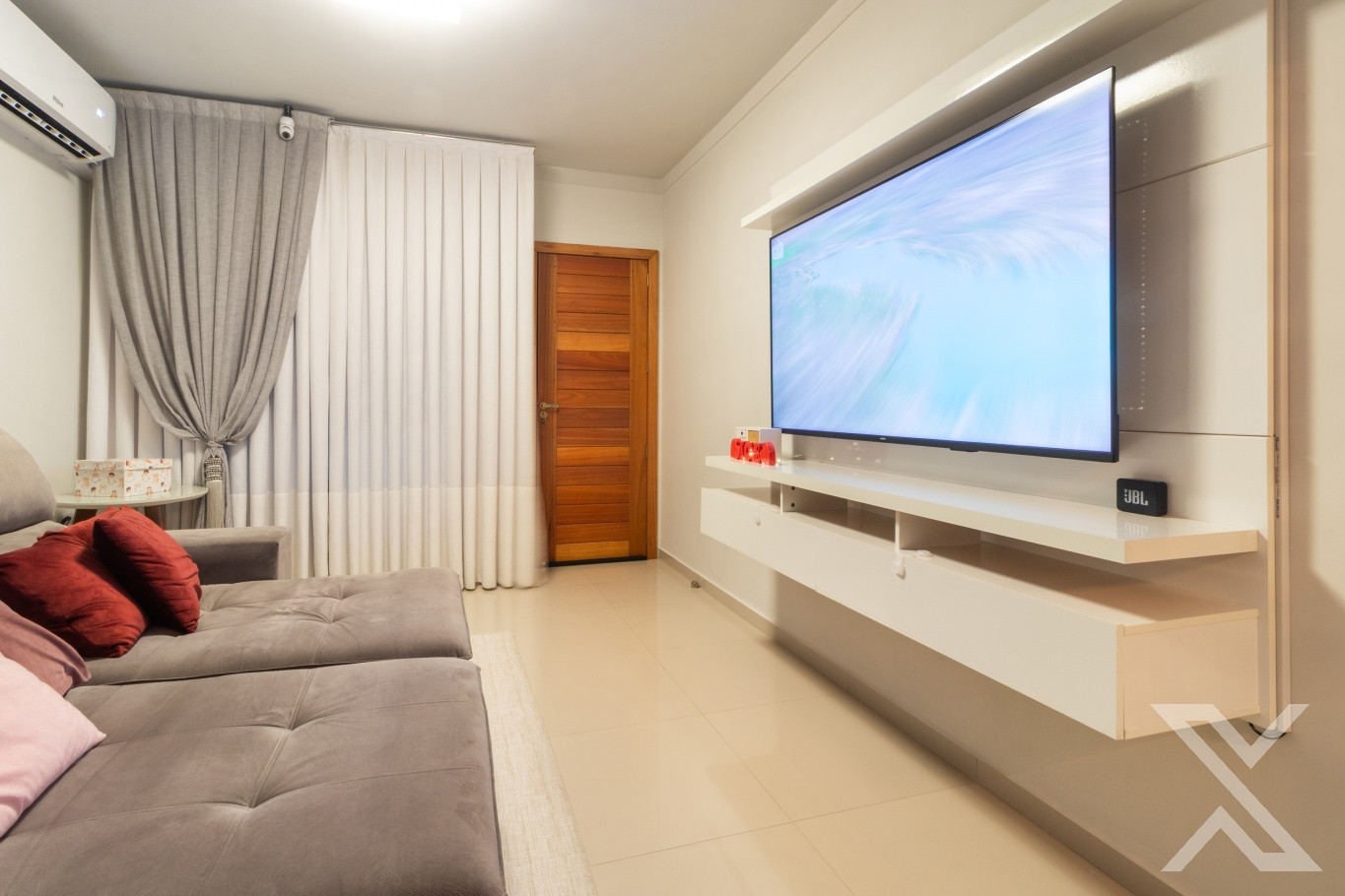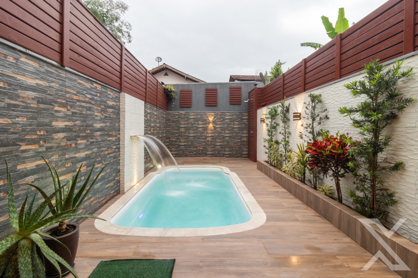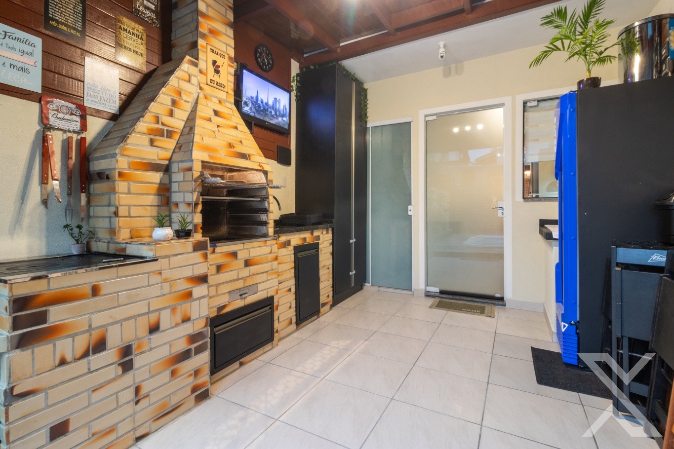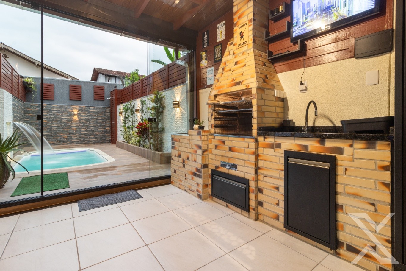 Revestimentos em porcelanato, forro rebaixado em gesso com iluminação personalizada, cobertura da área de festas com telhas sanduíches.