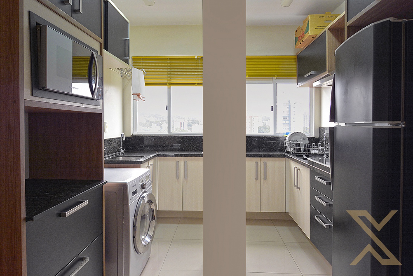 Cozinha e área de serviço com móveis sob medida, e eletros domésticos.
