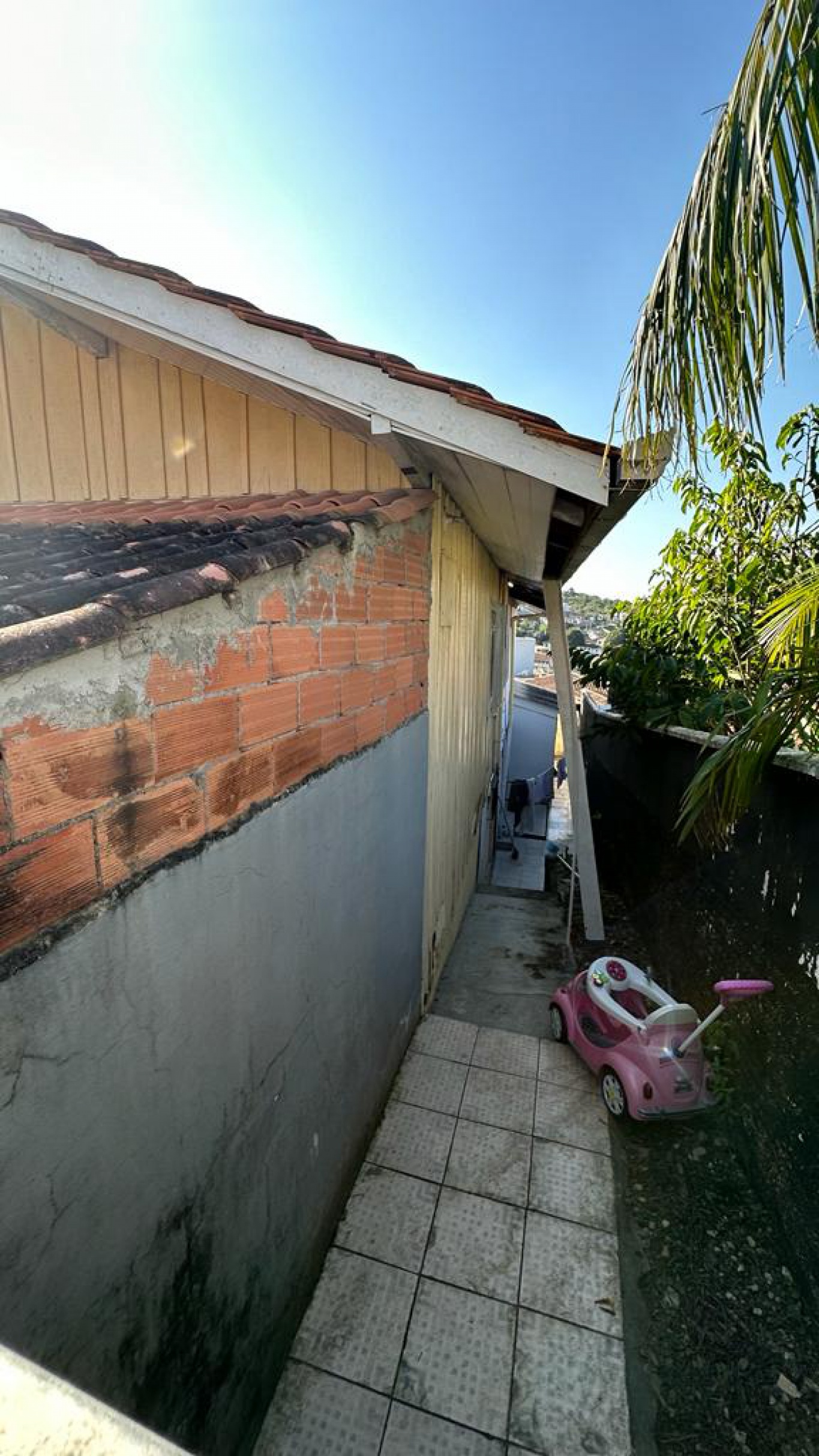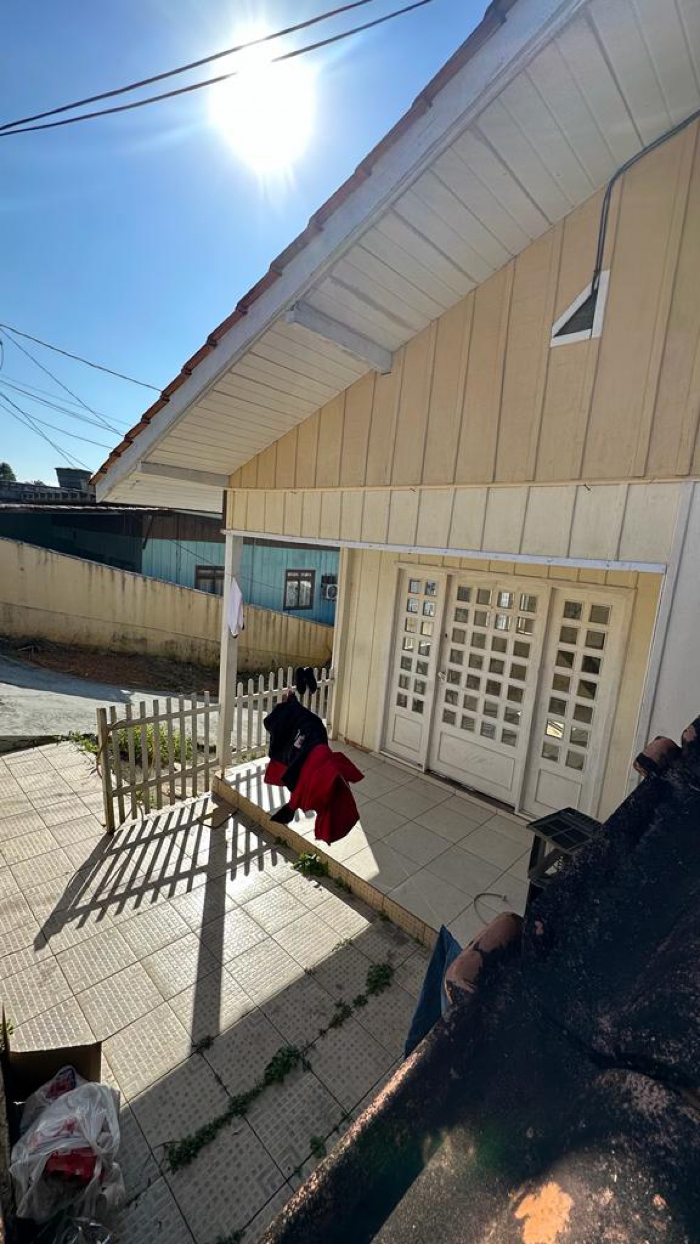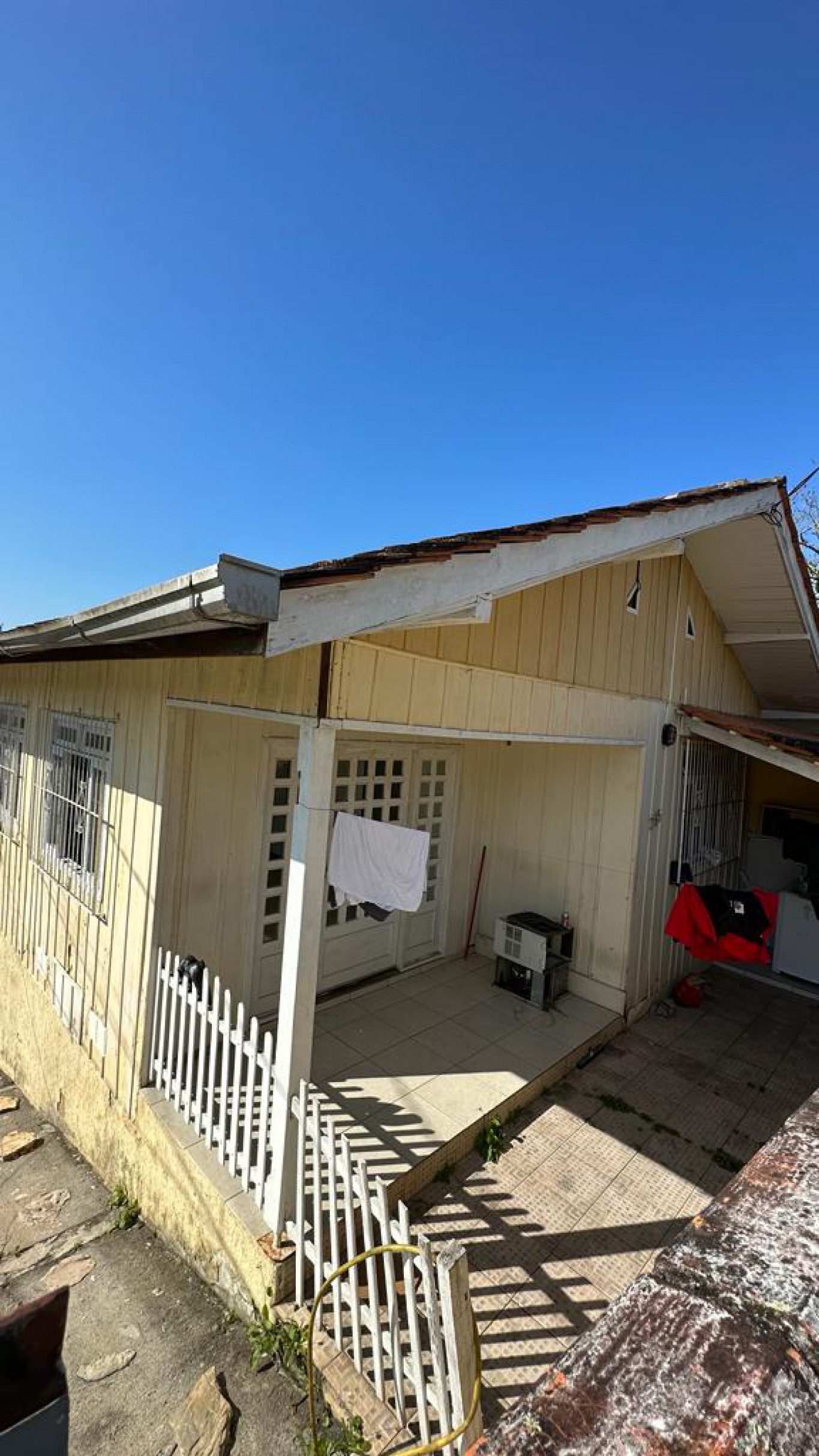 Sobre o terreno está edificado uma casa antiga de madeira.