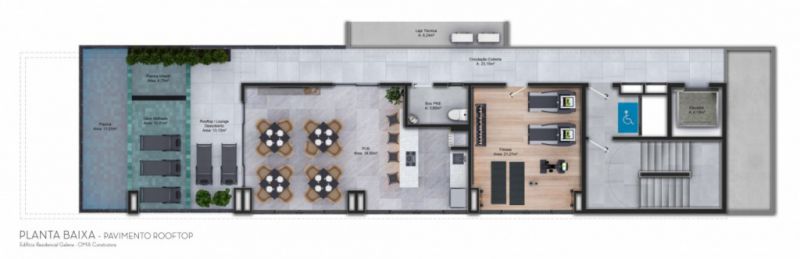 Área de lazer incluindo: rooftop com piscina, salão de festas mobiliado e decorado, academia, lavanderia coletiva e coworking.
