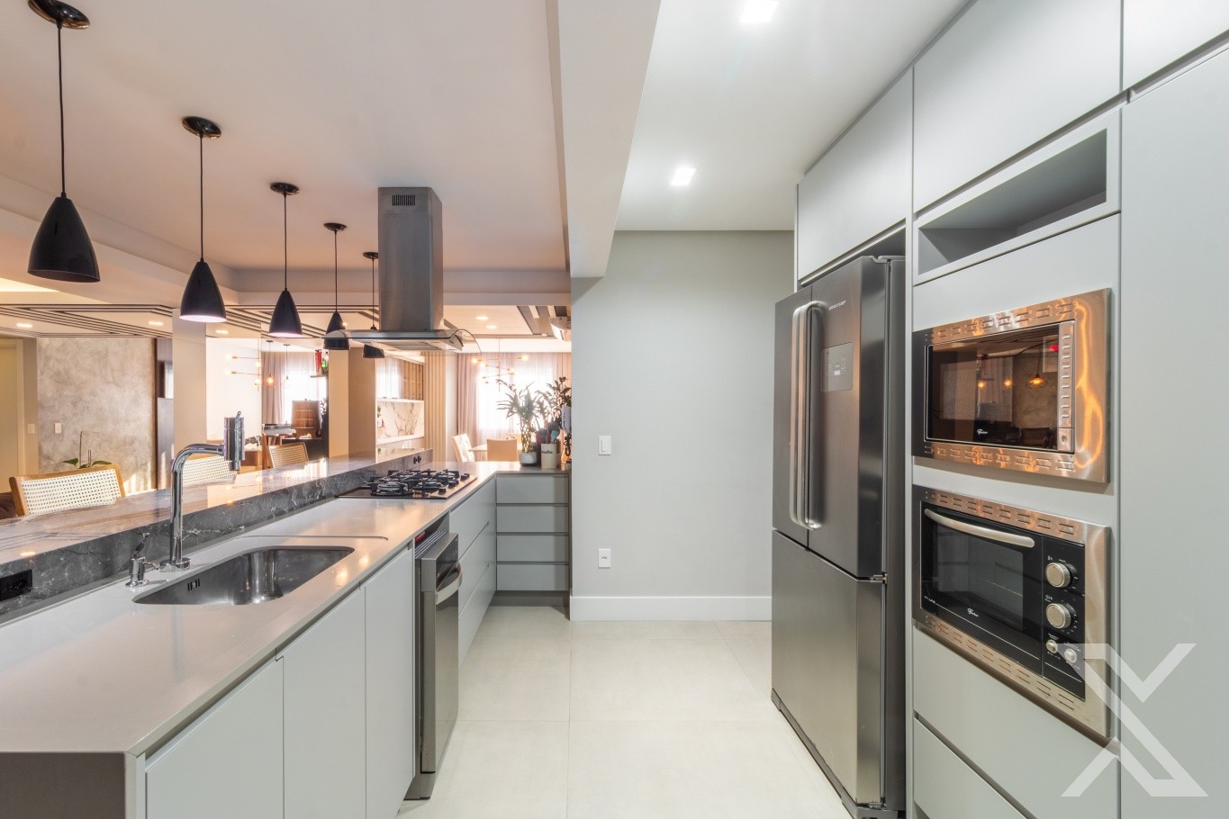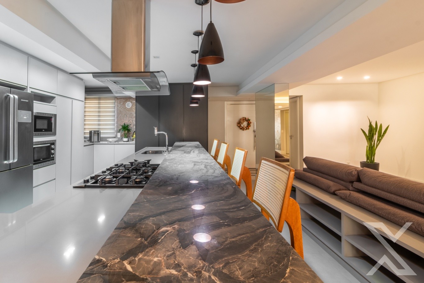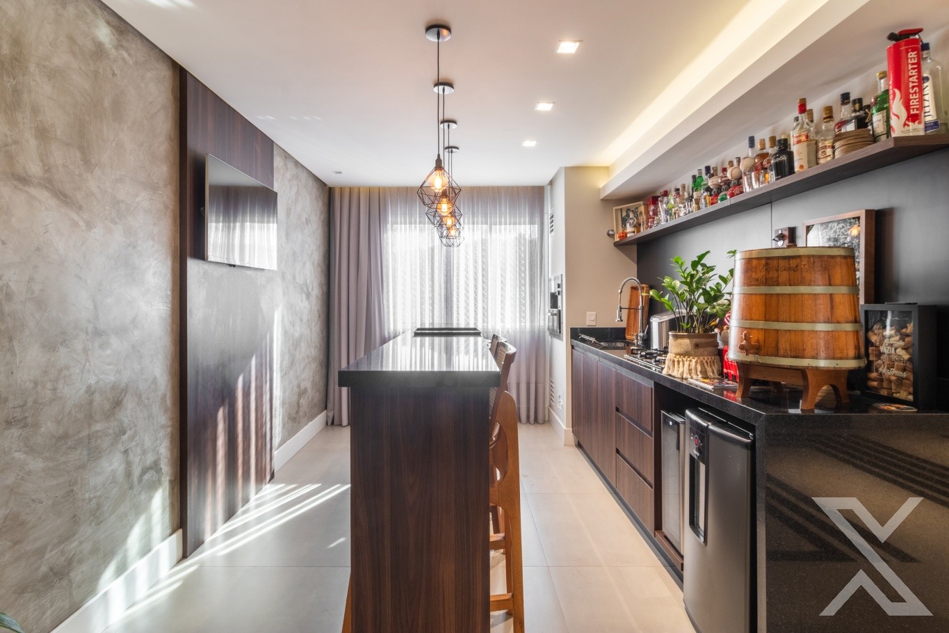 • Espaços integrados: living moderno com cozinha planejada e churrasqueira a gás, perfeito para momentos em família e recepções.