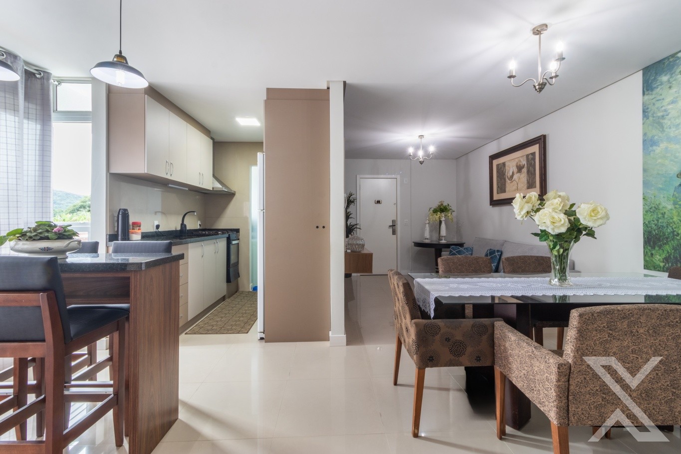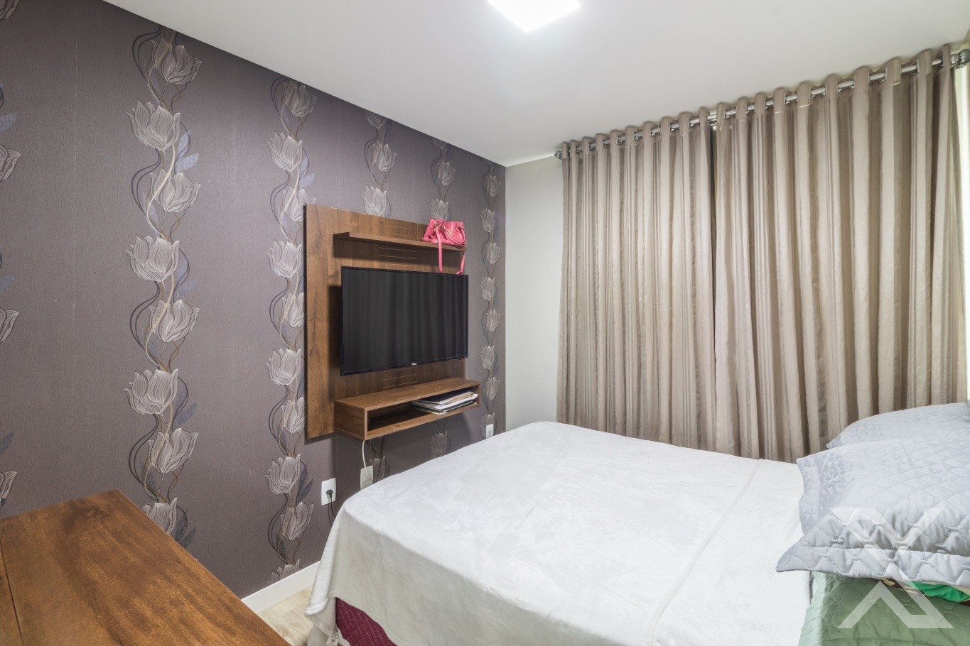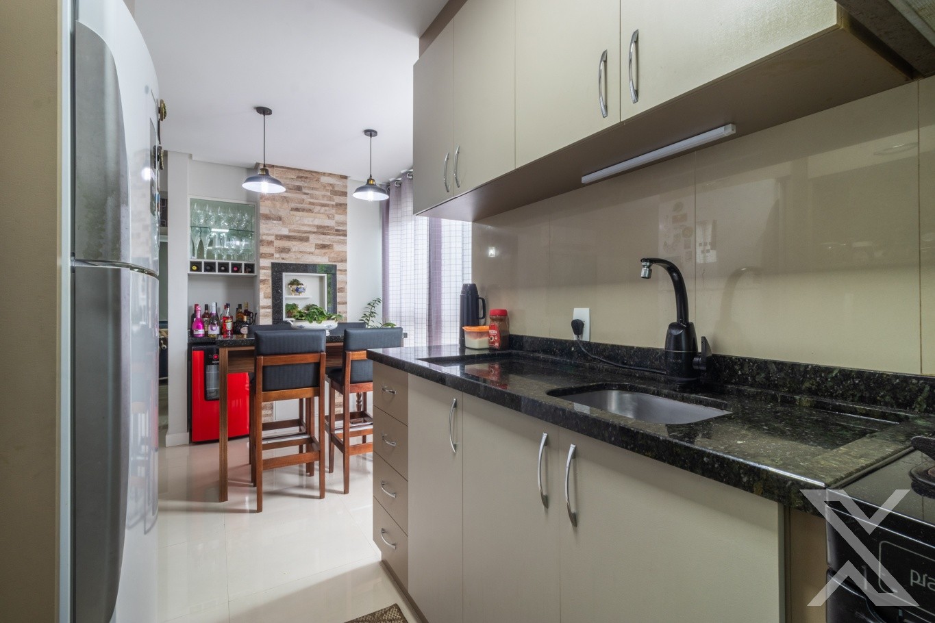O apartamento possuí 03 dormitórios sendo 01 suíte, sala de estar e jantar, cozinha, churrasqueira a carvão, banheiro social, área de serviço e 02 vagas de garagem coberta.