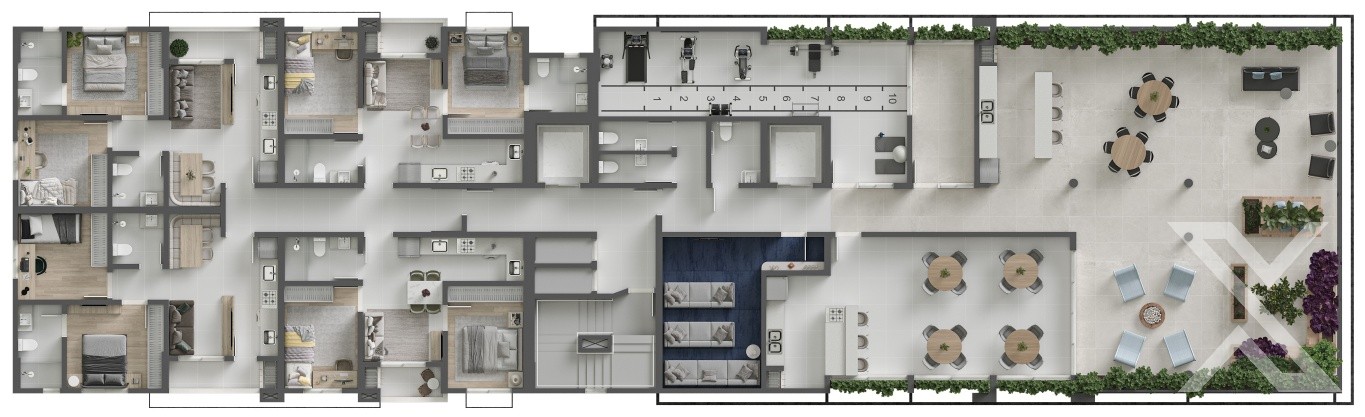 Planta Tipo 7 e 9 com 2 dormitórios com varanda com churrasqueira.
