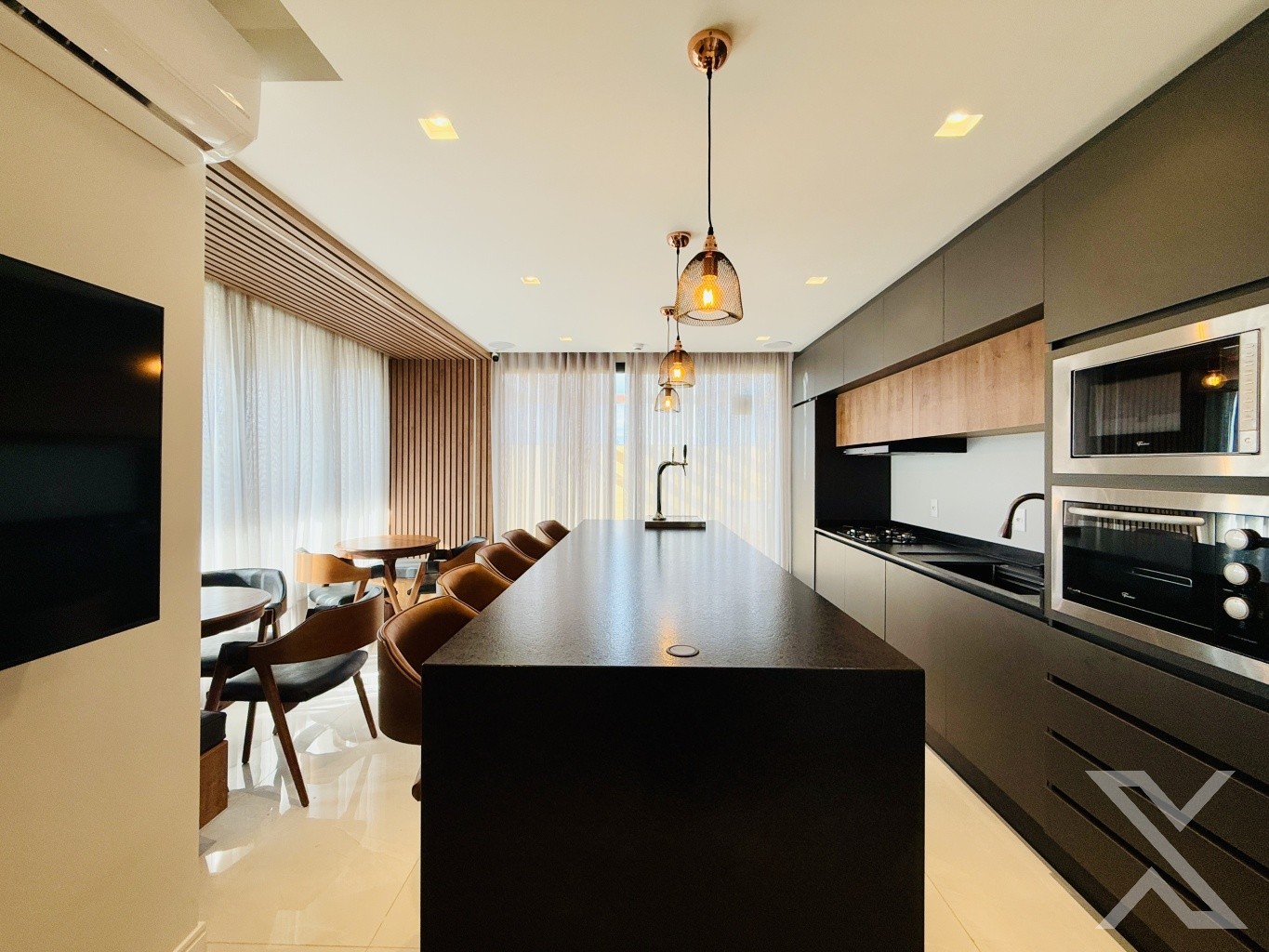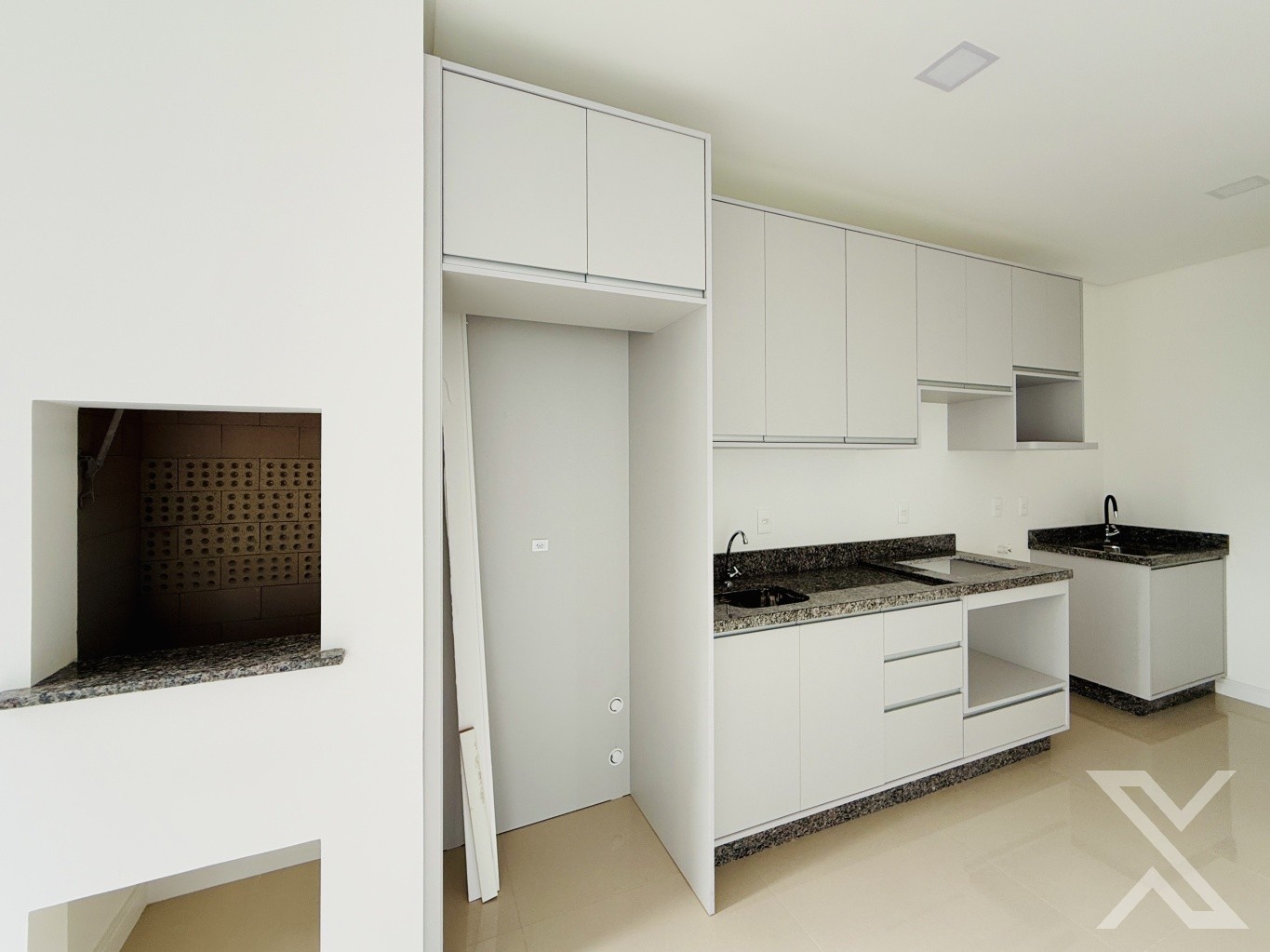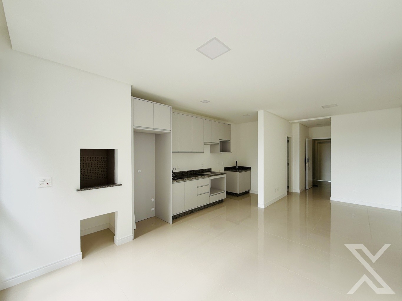 Com um design funcional e elegante, o apartamento conta com uma ampla sala de estar integrada à cozinha, proporcionando um ambiente espaçoso e acolhedor. A churrasqueira a carvão é um destaque, perfeita para momentos de confraternização e refeições especiais.