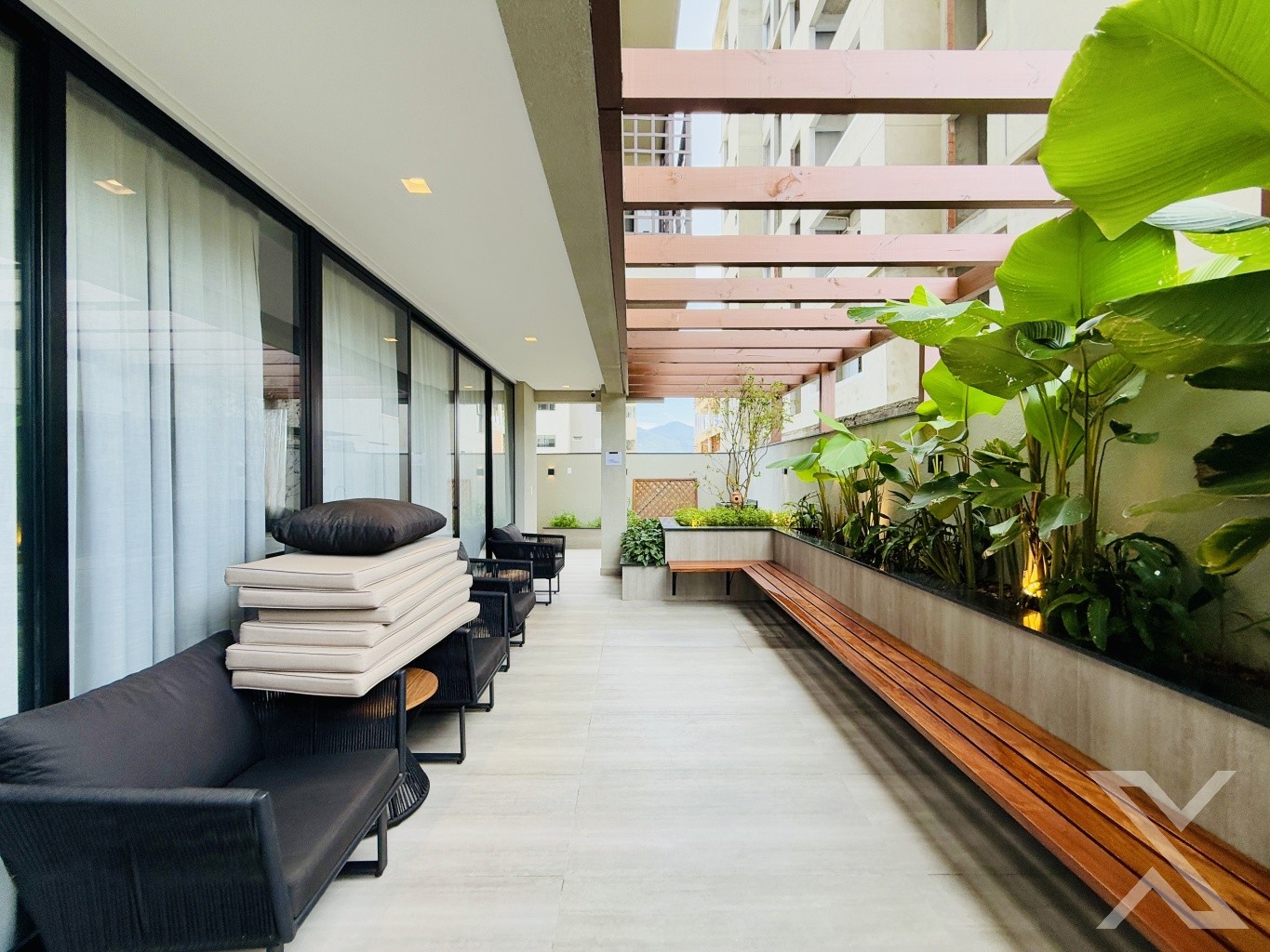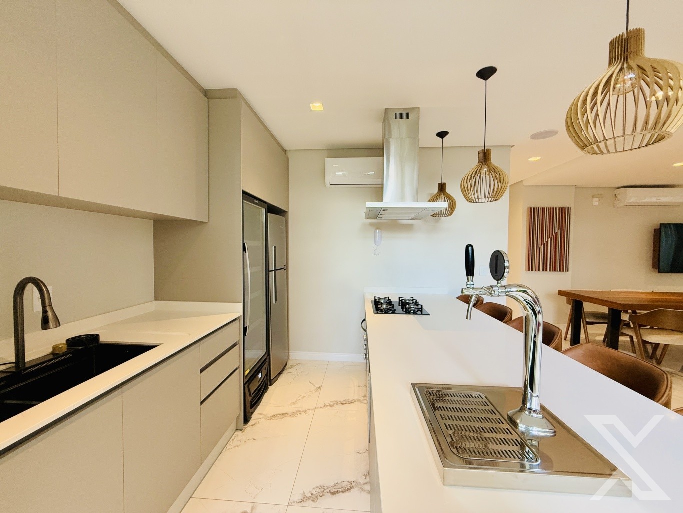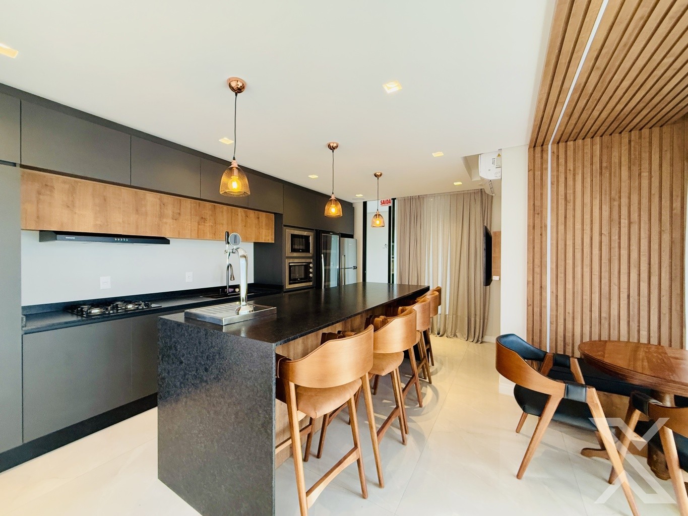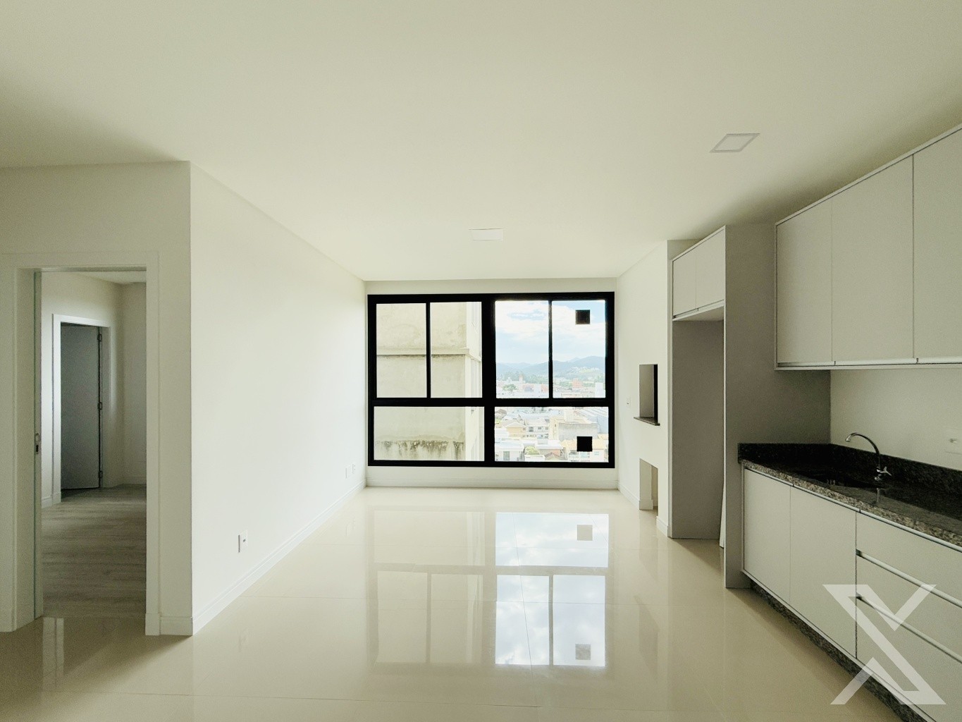 Com um design funcional e elegante, o apartamento conta com uma ampla sala de estar integrada à cozinha, proporcionando um ambiente espaçoso e acolhedor. A churrasqueira a carvão é um destaque, perfeita para momentos de confraternização e refeições especiais.