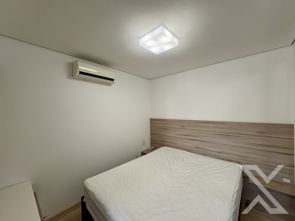 ● Quarto com cama, ar-condicionado, piso laminado, roupeiro e espaço para escritório.