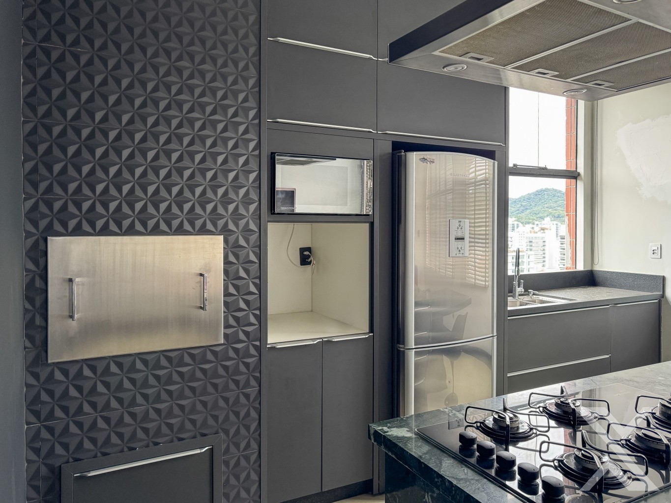 ● Cozinha mobiliada com geladeira, fogão e microondas.