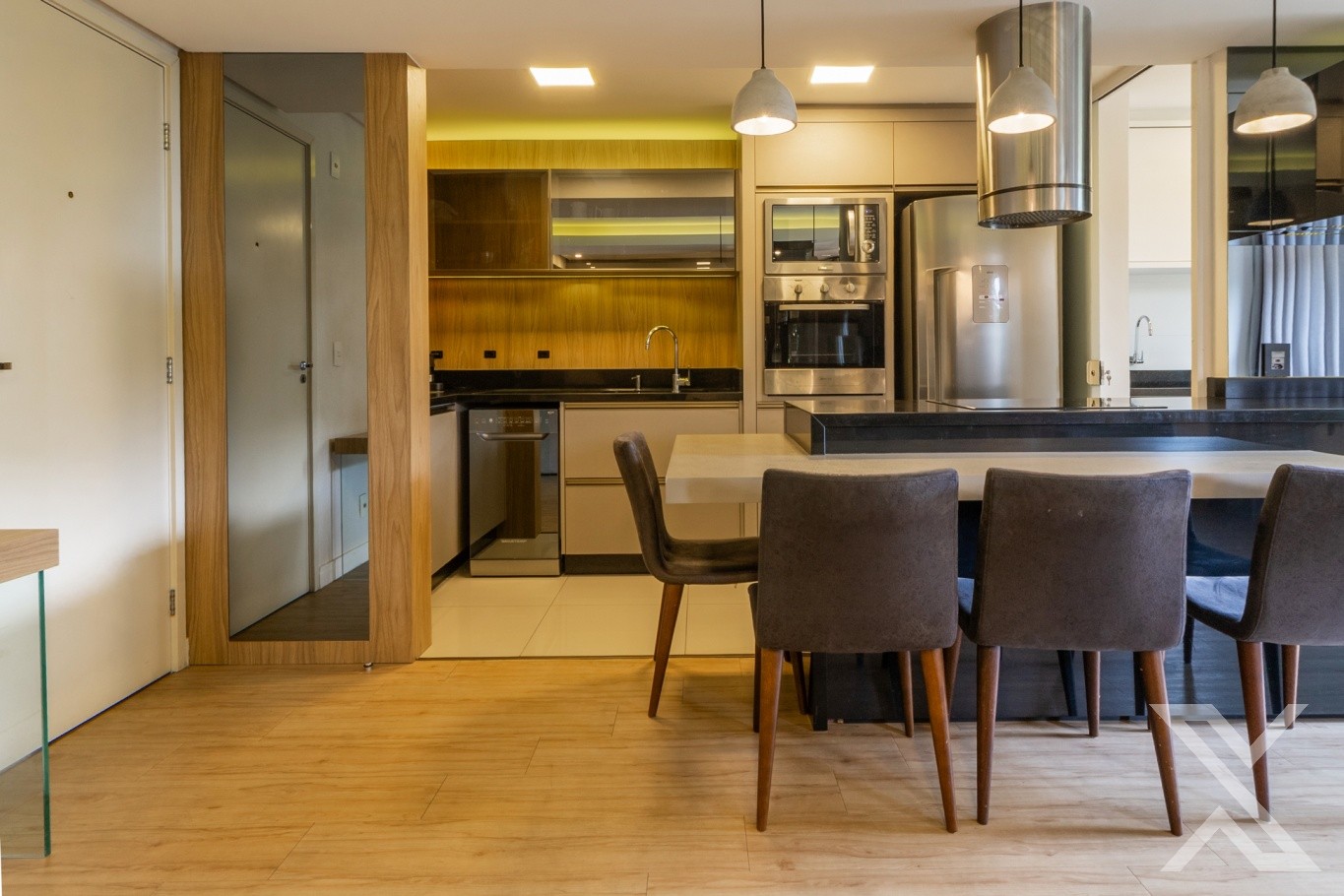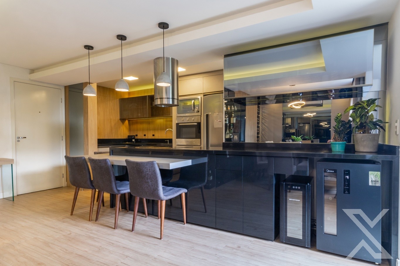 Apartamento entregue totalmente mobiliado, incluindo eletrodomésticos, proporcionando praticidade e economia. Modificação de planta que ampliou os ambientes de convivência.