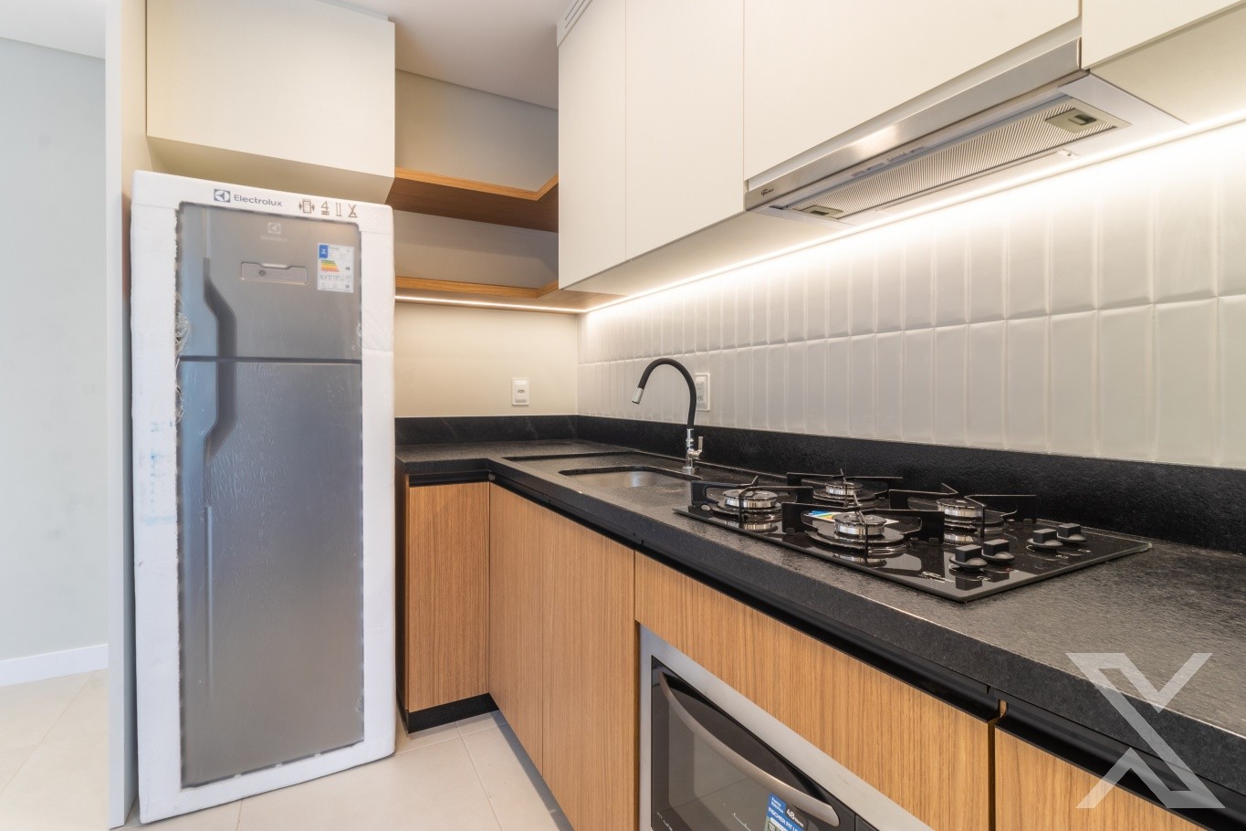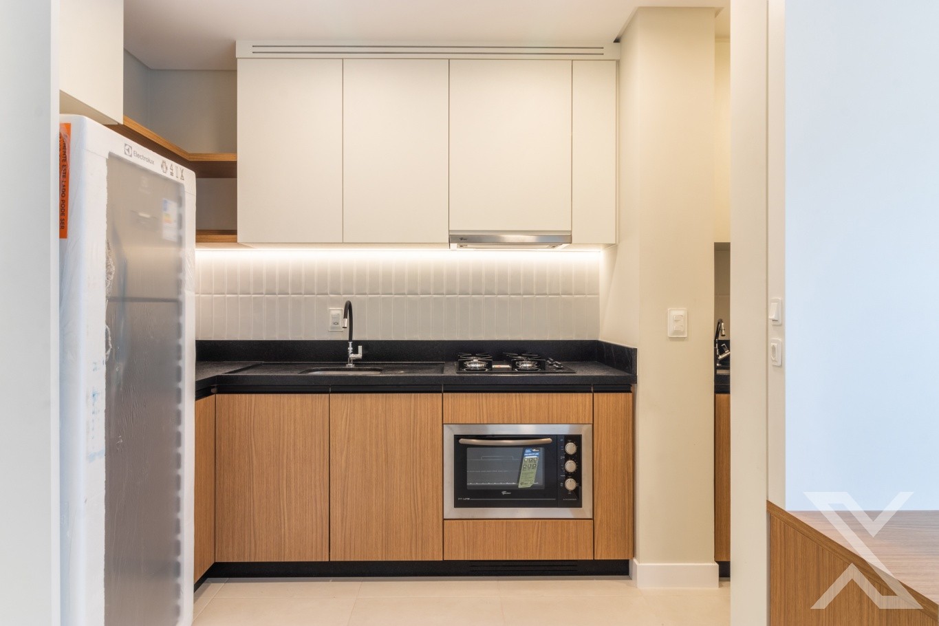 ● Cozinha completa com geladeira, fogão, forno e depurador.