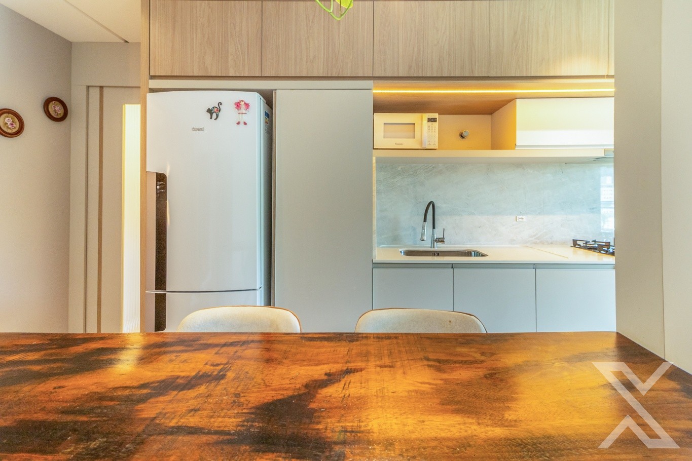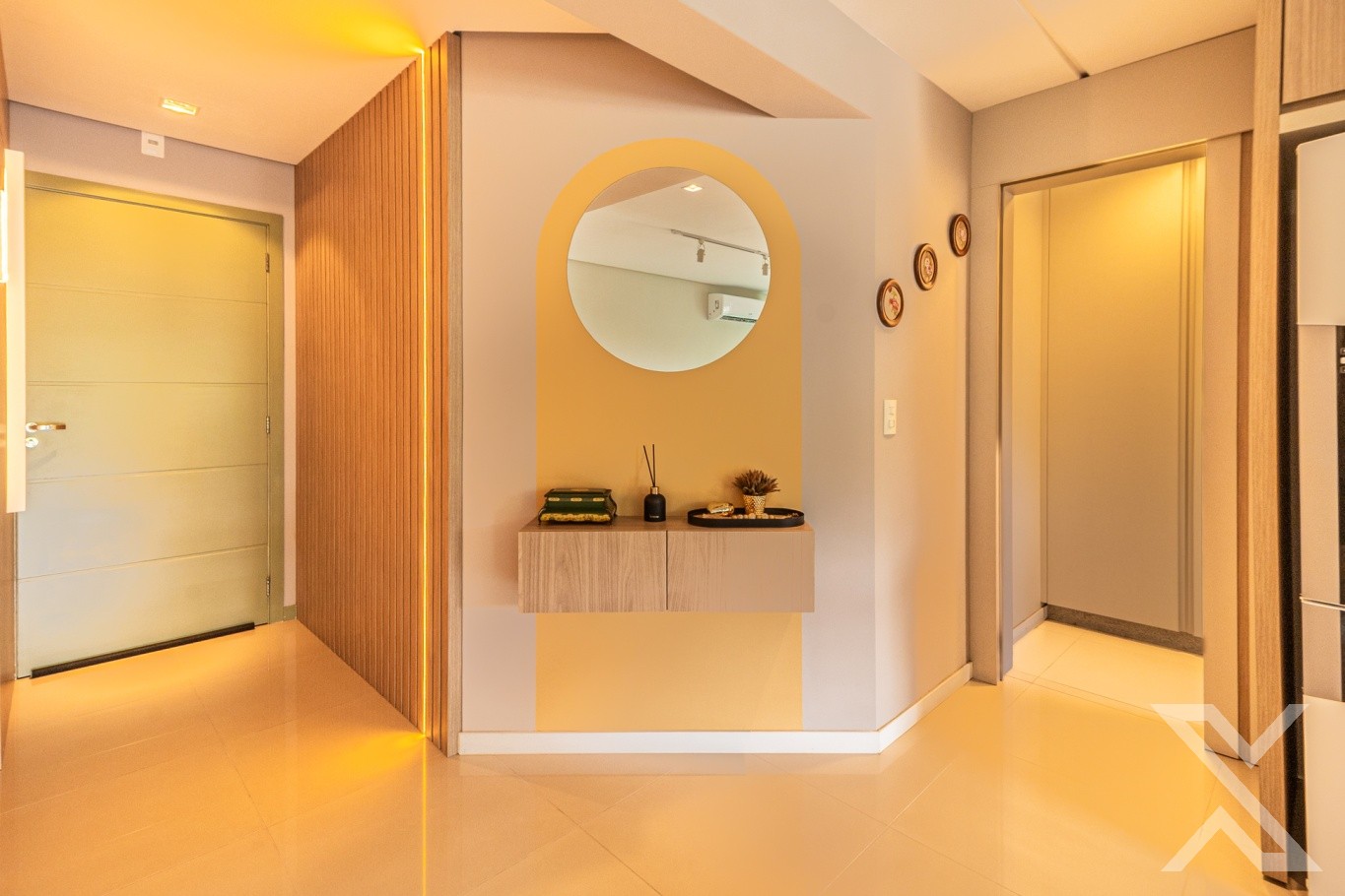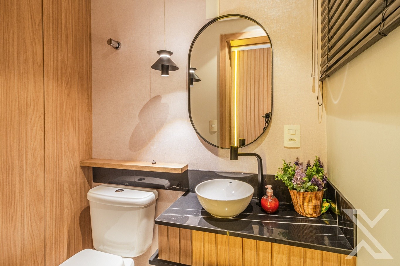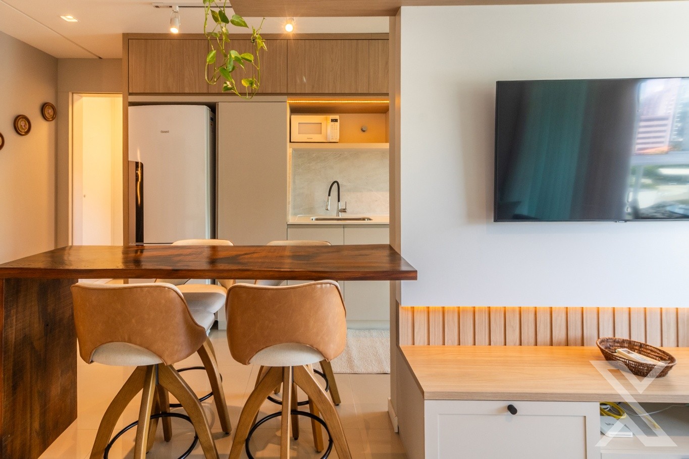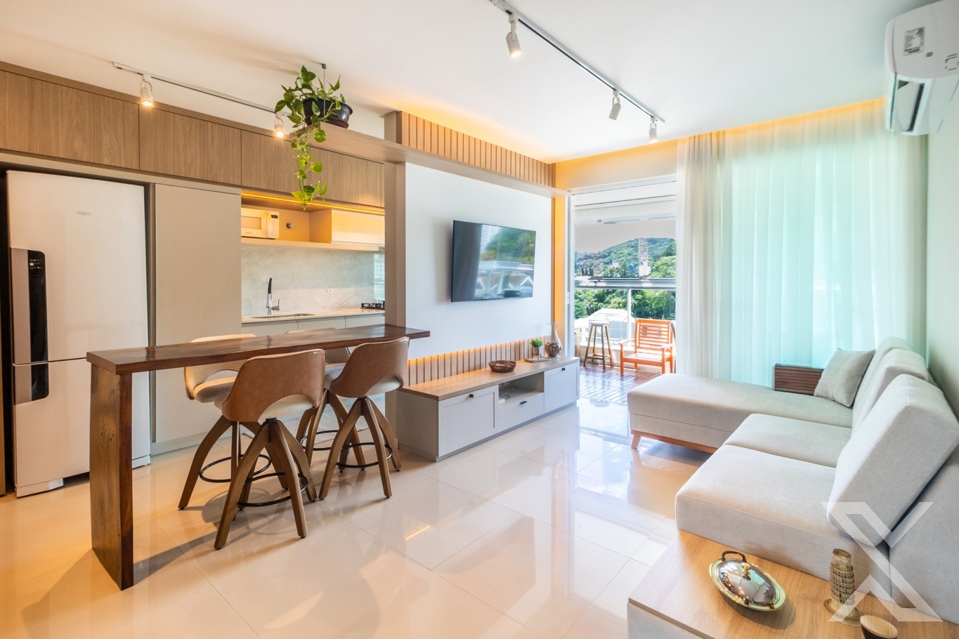 Revestimentos em porcelanato, rebaixo em gesso com iluminação indireta, sistema de água quente à gás, sacada com churrasqueira.