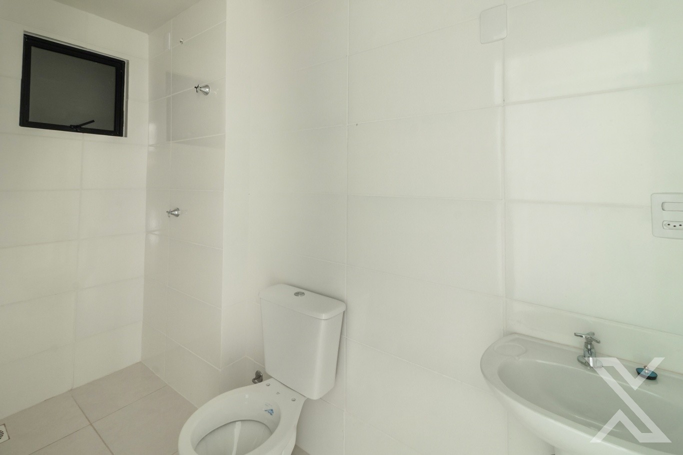 Apartamento possui acabamento em cerâmica em todos os ambientes, portas brancas, cantoneiras de gesso na sala.