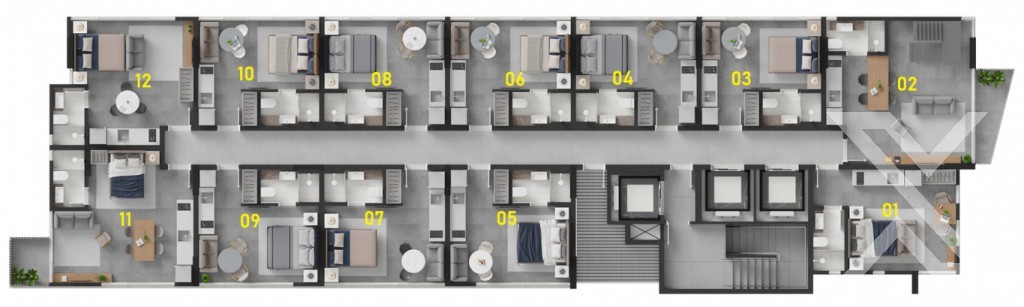 Revestimentos em vinílico e porcelanato, forro rebaixado em gesso.