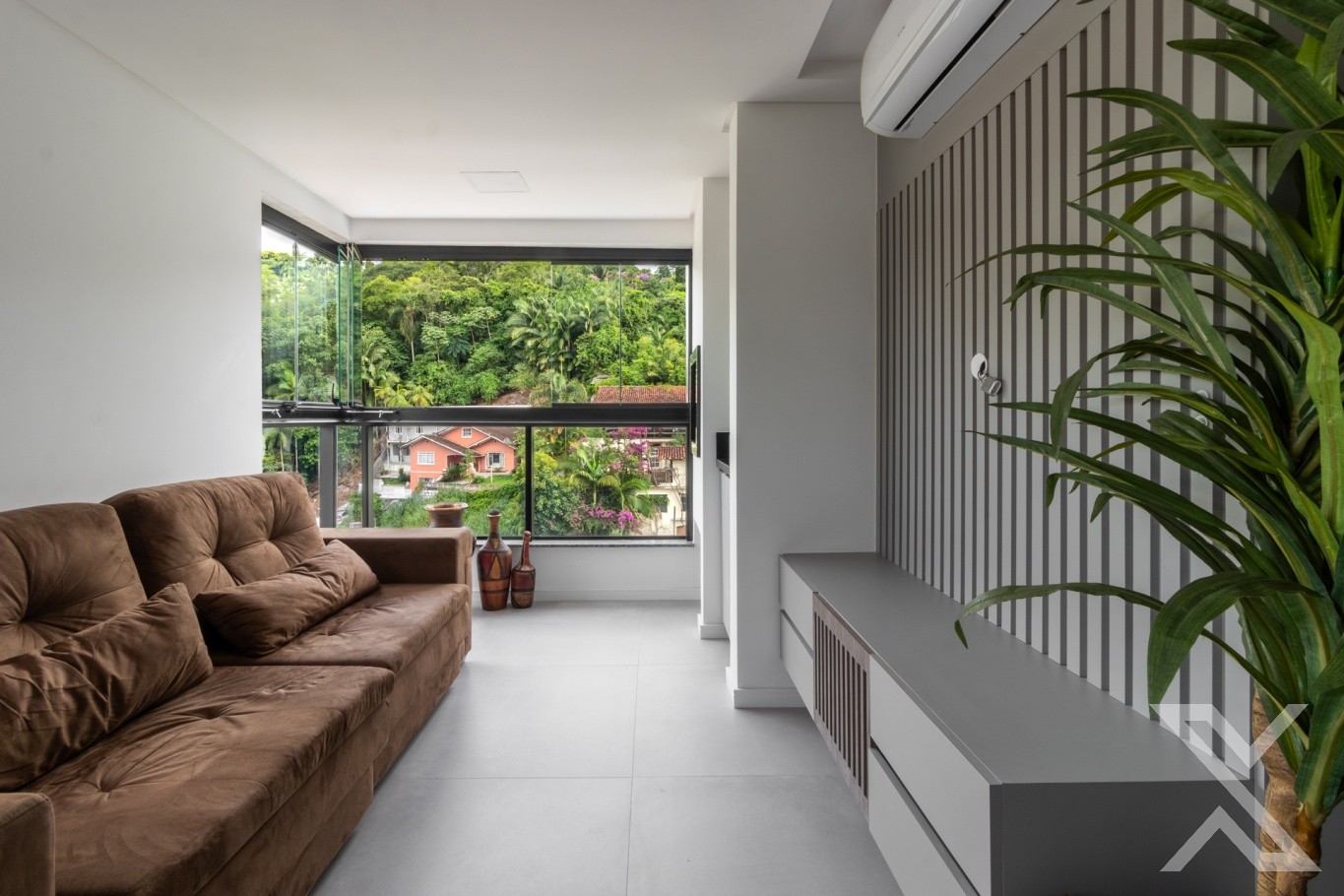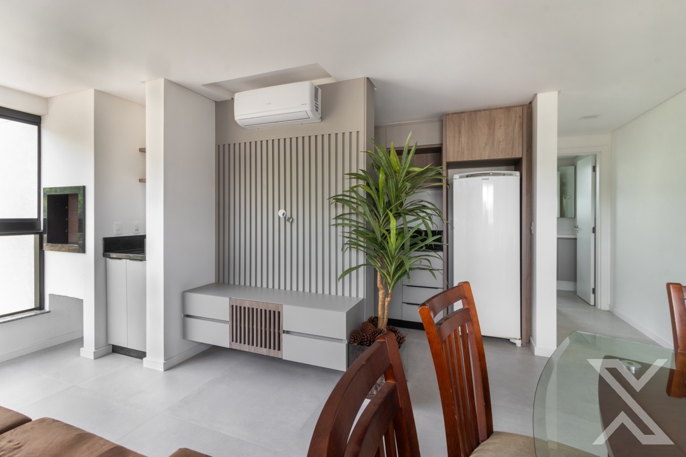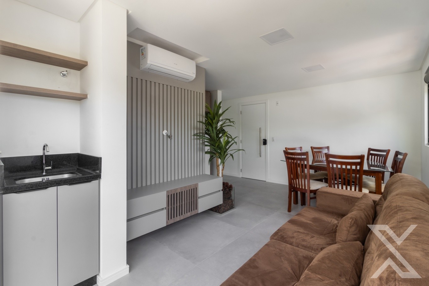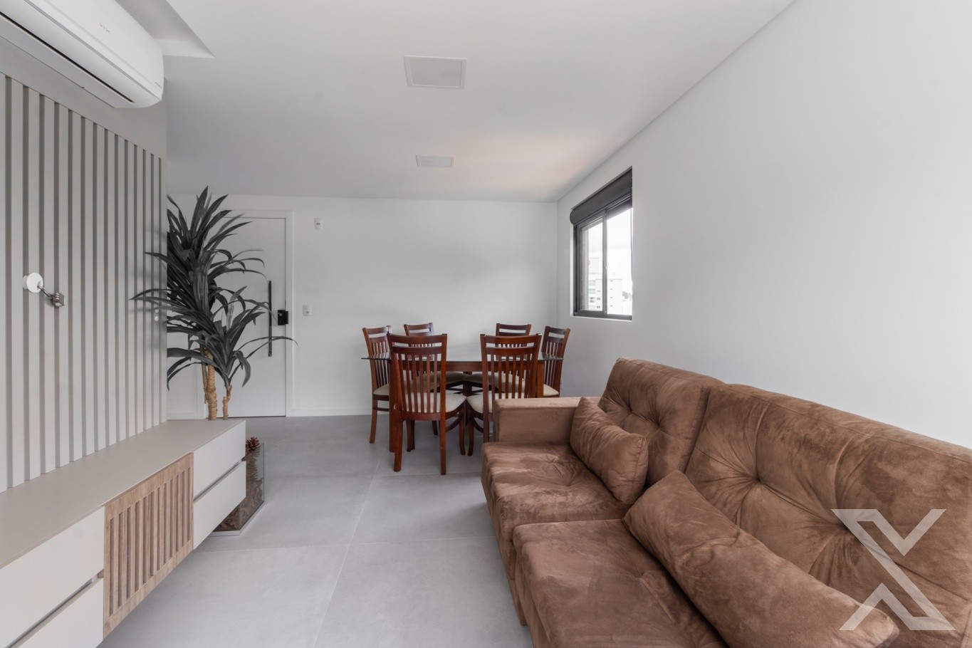 ● Sala integrada com ar-condicionado, sofá e mesa de jantar.