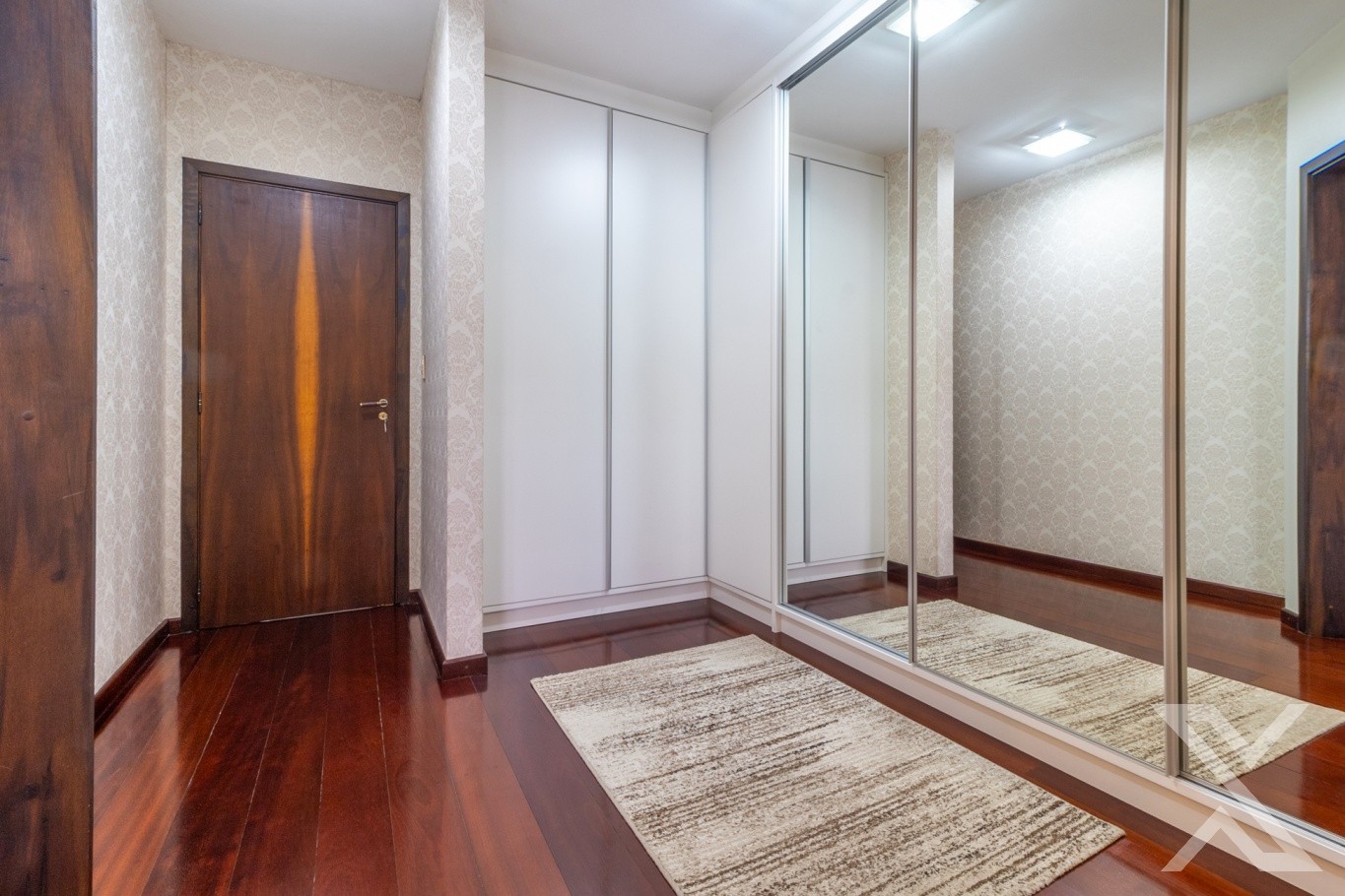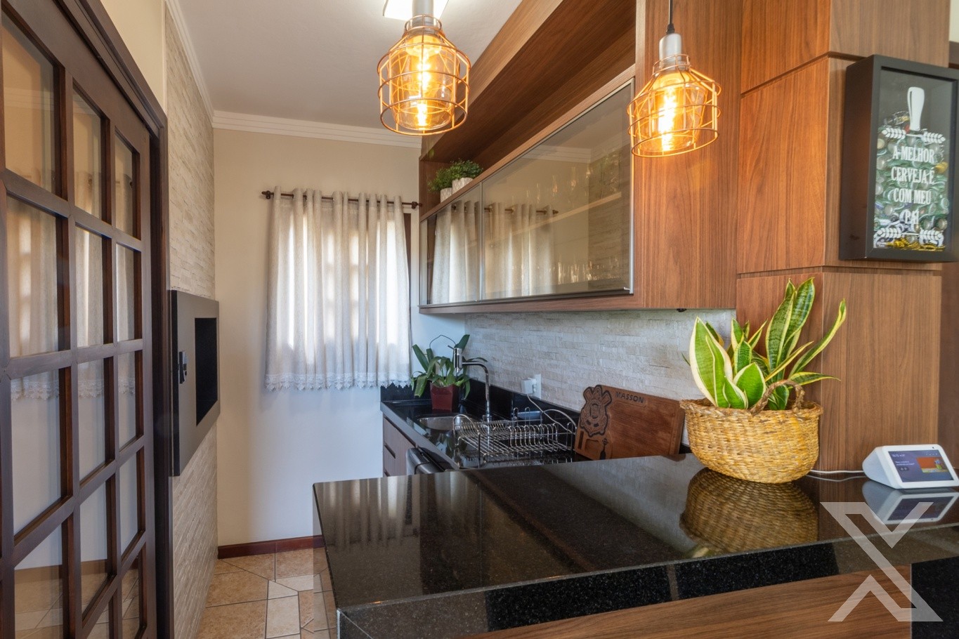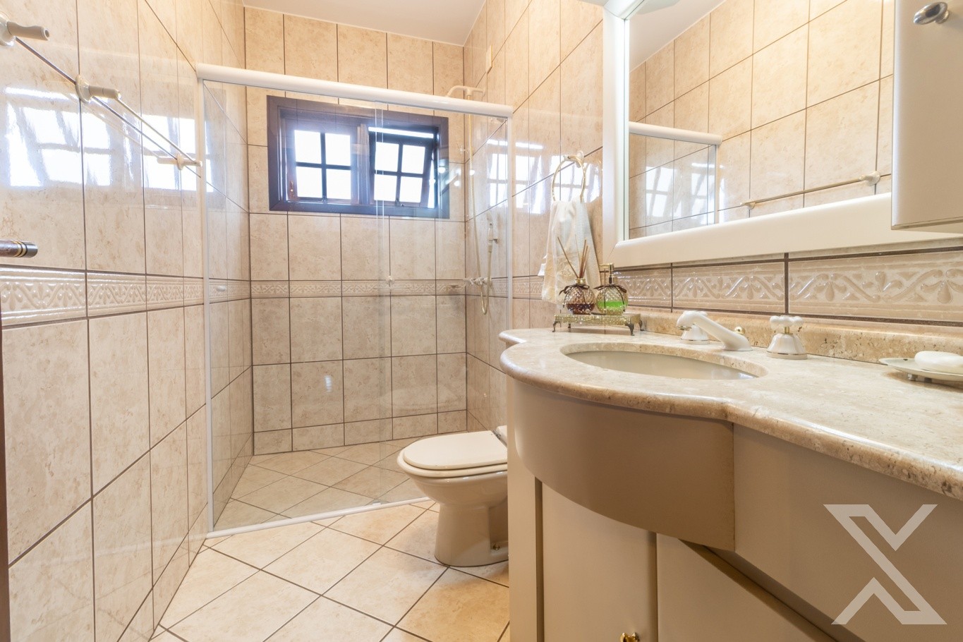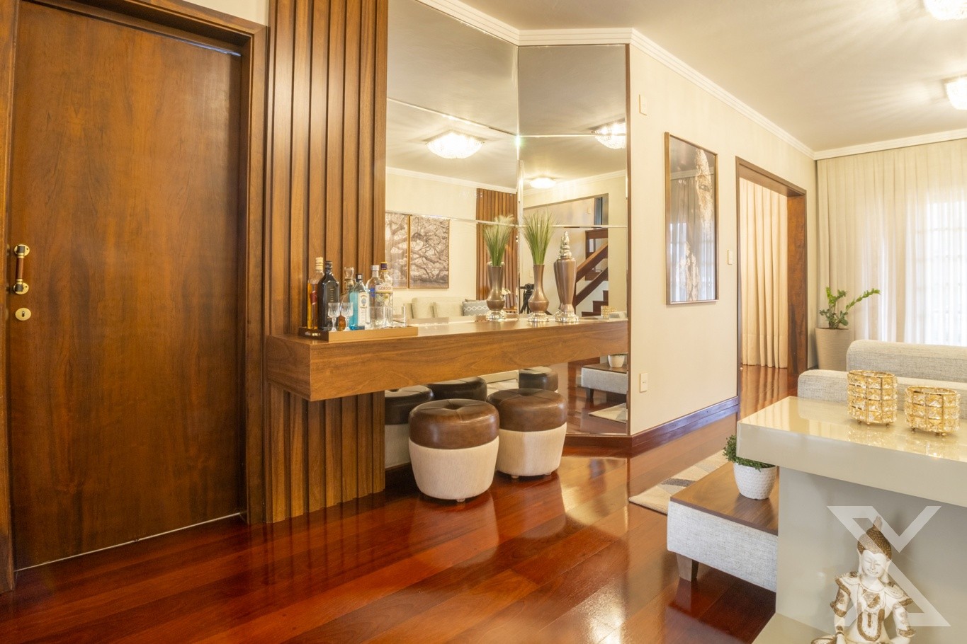 Revestimentos em madeira, forro rebaixado em gesso com iluminação personalizada, aquecimento de água a gás.